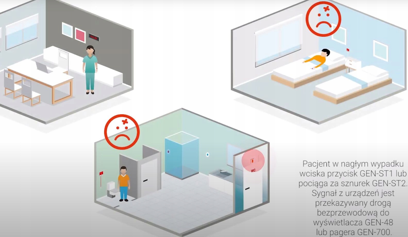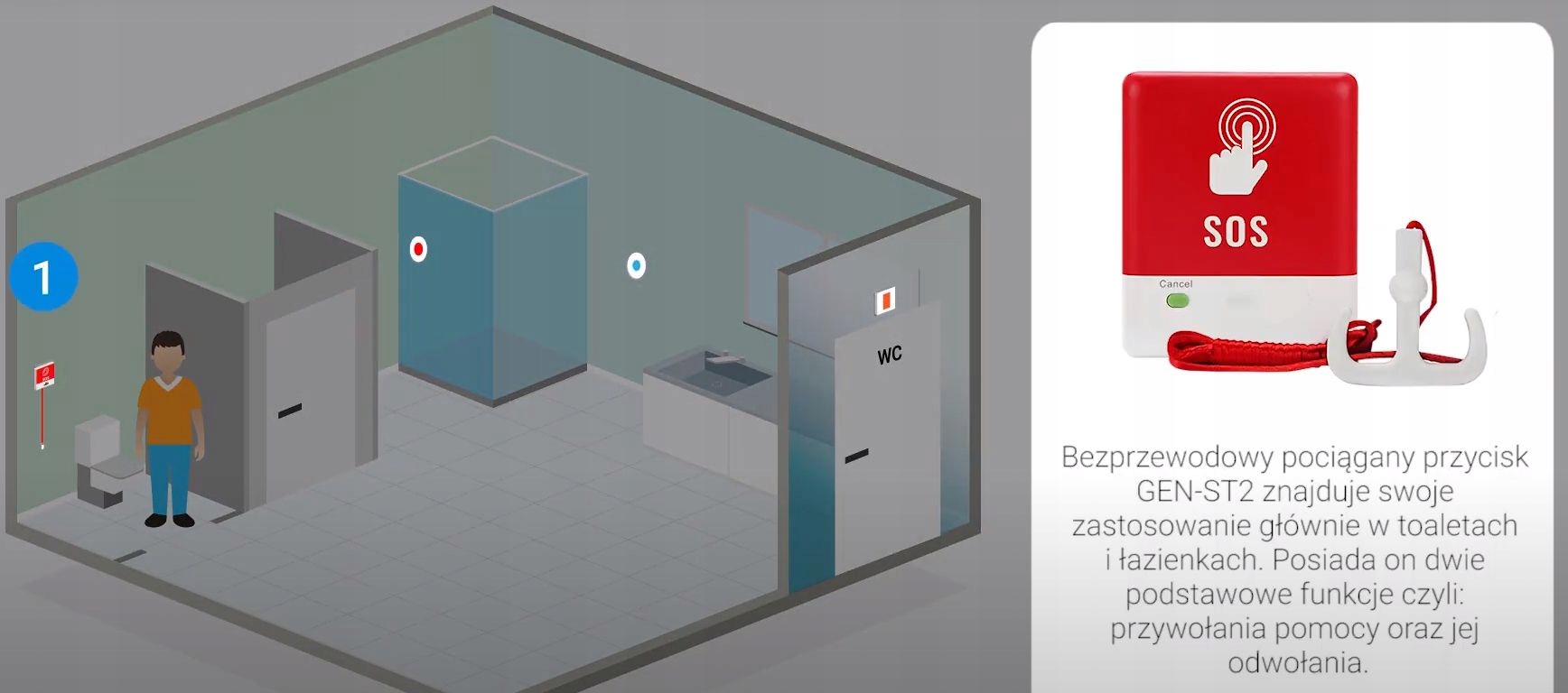 Беспроводная водонепроницаемая кнопка. Чаще всего используется в туалетах. Используется для вызова помощи в экстренных ситуациях, таких как обморок, инфаркт и т. д. Яркий цвет ручки, ее длина и гибкость позволяют быстро найти ее и рефлекторно использовать.