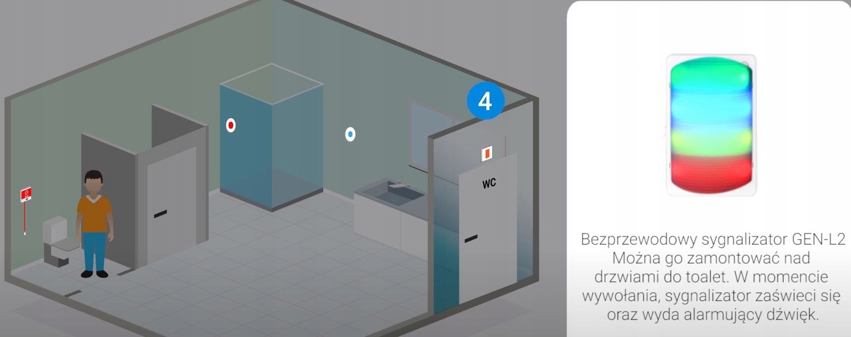 Может быть установлена над дверью или в видимом для персонала месте. Когда пациент обращается за помощью, сигнализация издает оптико-акустический сигнал, что облегчает персоналу поиск человека, нуждающегося в помощи.