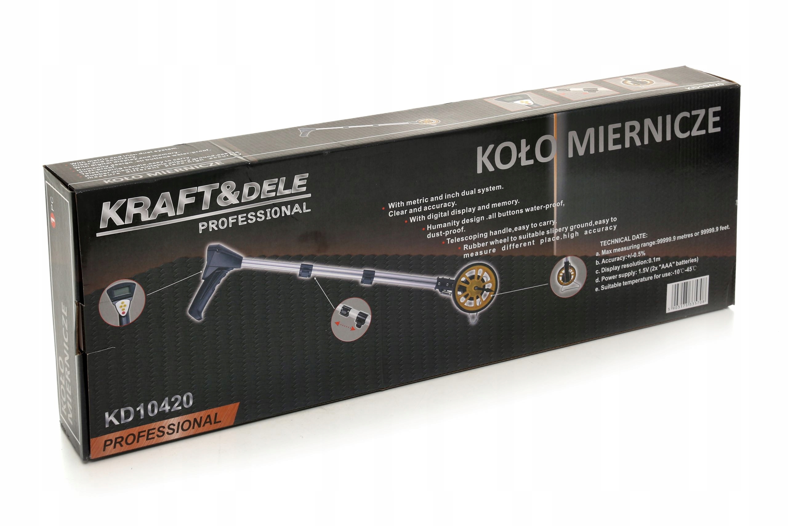 Измерительное колесо (одометр), оснащенное электронной системой измерения расстояния с четким ЖК-дисплеем. Металлическая ножка позволяет безопасно разместить устройство в вертикальном положении. В комплект входит практичная и удобная сумка для транспортировки. Измерительное колесо используется во многих областях, таких как измерения полей и дорог, дорожных покрытий или спортивных площадок, а также измерения дома и сада, посадка деревьев и т. д.