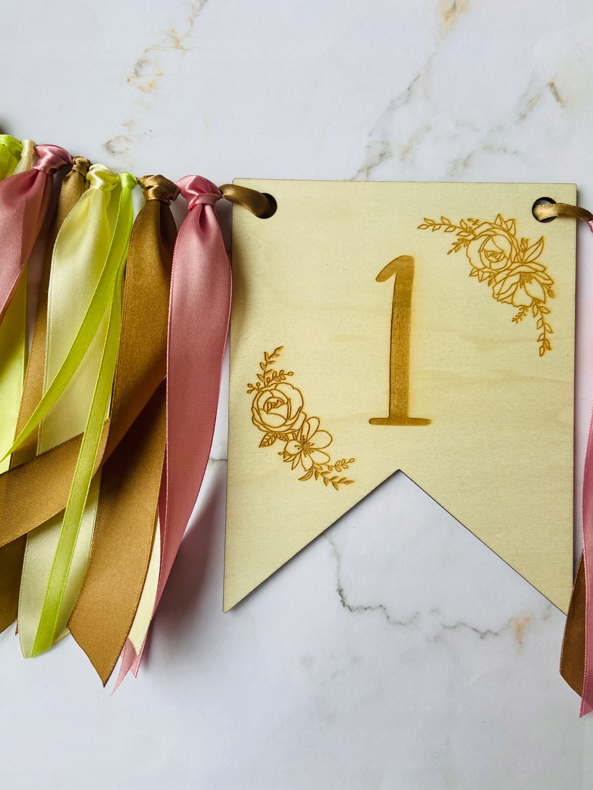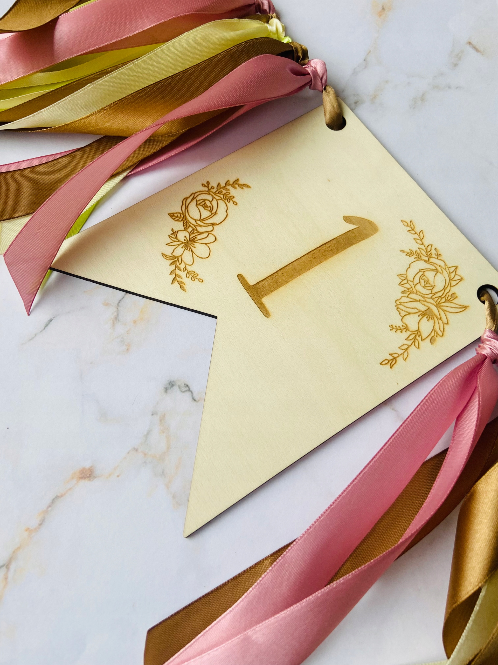 Вымпел на стул с любым номером и разноцветными лентами с розовым оттенком - из деревянной фанеры с цветочным узором. Любое число на выбор. Размеры вымпела 14 х 17,5 см. Наши деревянные вымпелы по размеру точно такие же, как и бумажные :)