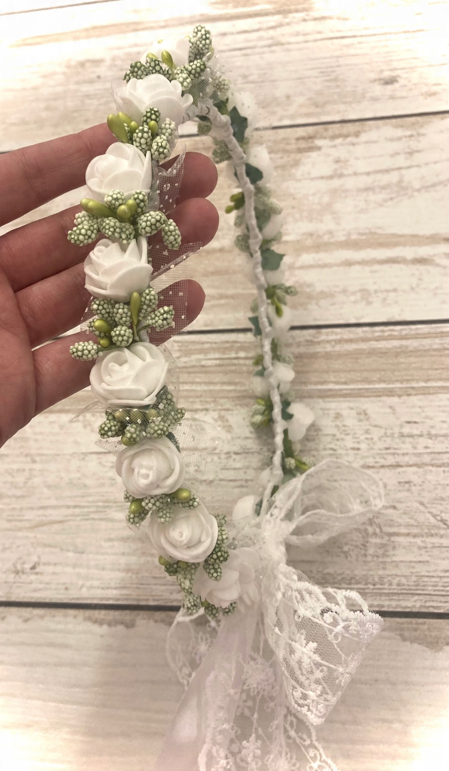 Размер стандартного венка примерно 54 см, регулируется. Цвета: грязно-белый и зеленый. Венок красиво смотрится и привлекает внимание благодаря плотно сплетенной фурнитуре. С другой стороны, это элегантно, скромно и соответствует случаю. Уникальный элемент – красивый кружевной бантик. Пожалуйста!