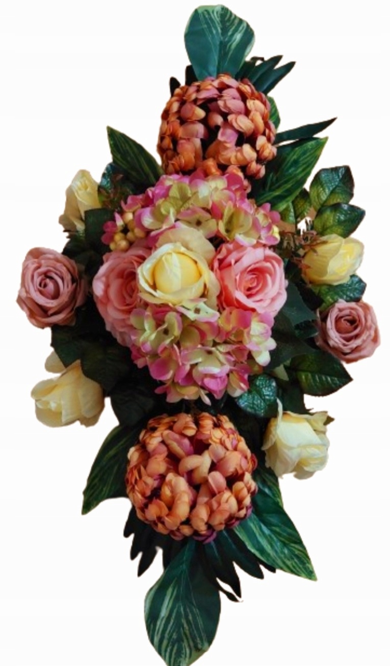Красивая надгробная композиция с искусственными цветами, тяжелая в горшке на еловой настиле.
