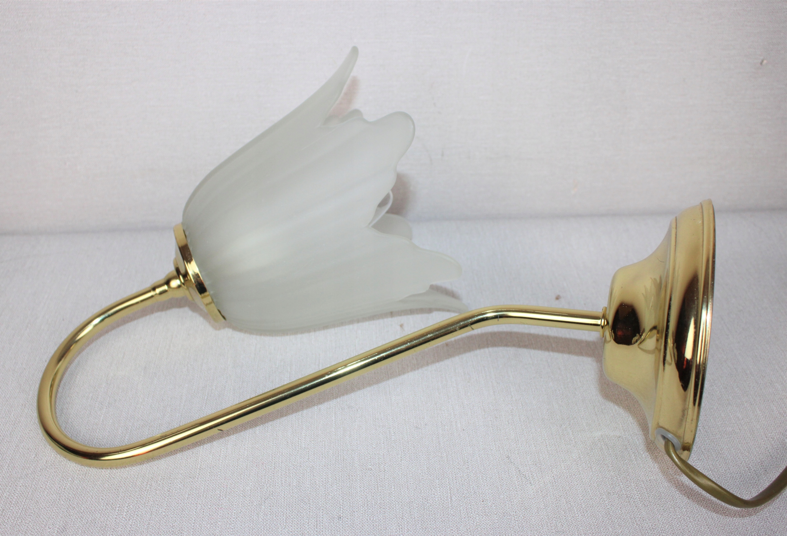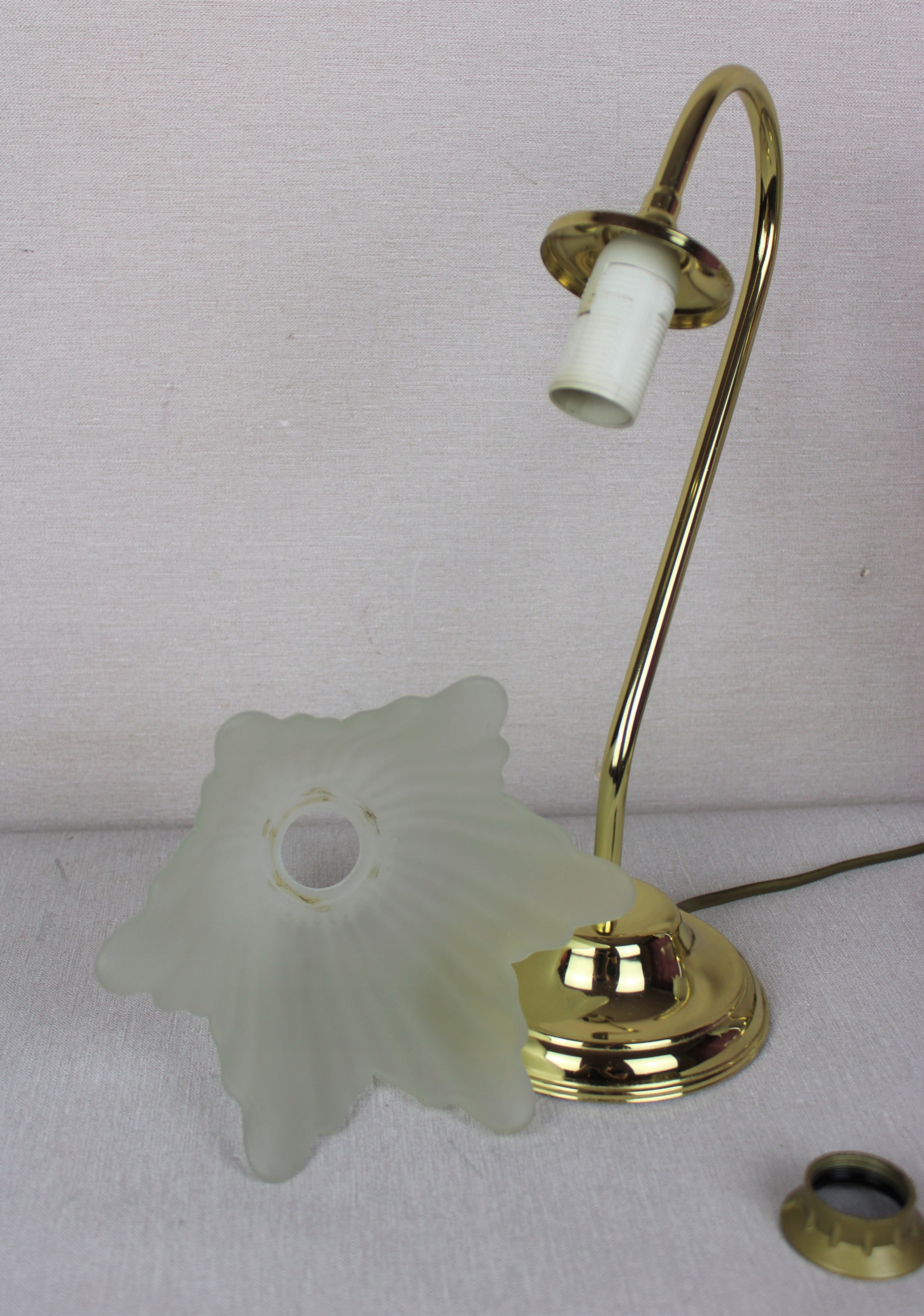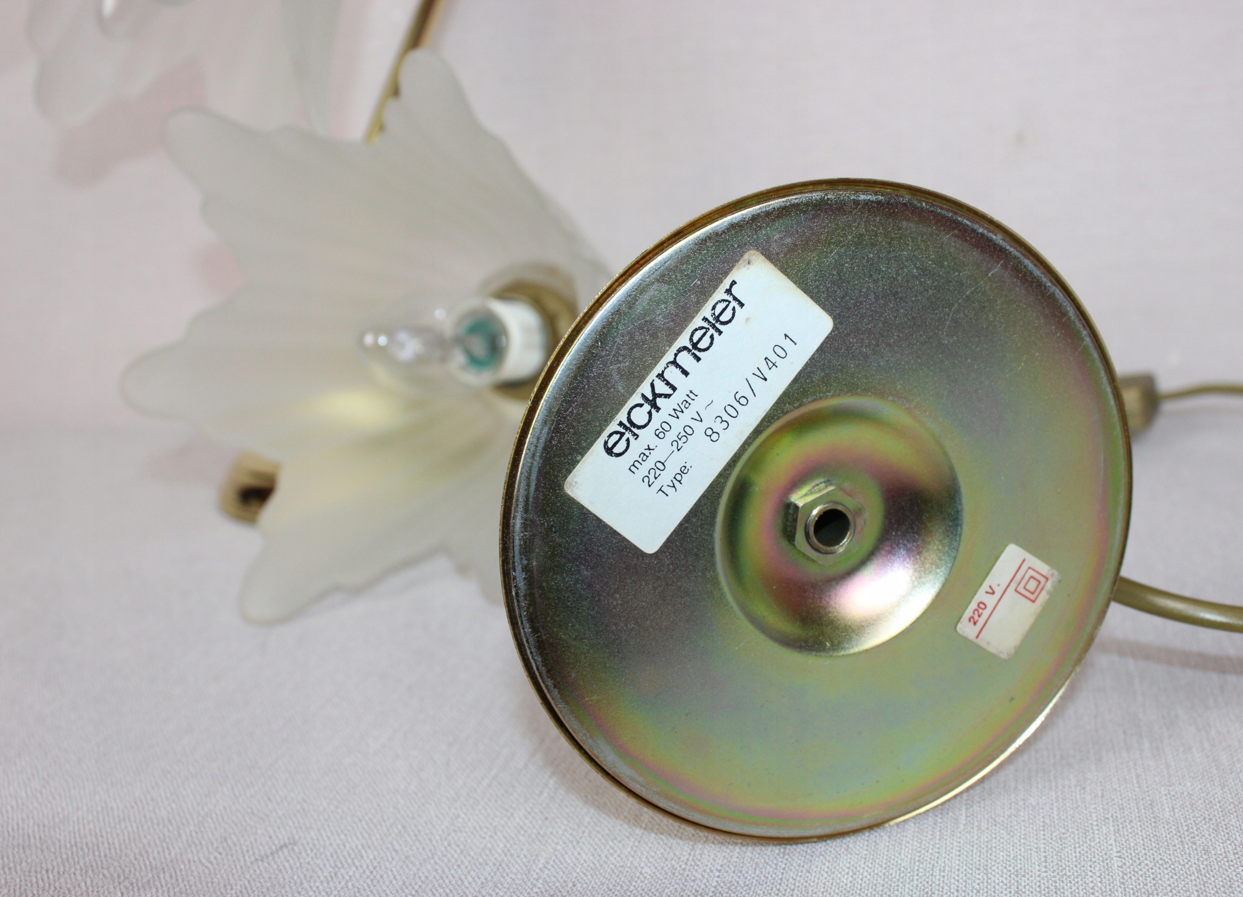 Прикроватная настольная лампа от Eickmeier, Германия. Основа изготовлена из металла золотистого цвета. Абажур стеклянный, без трещин и сколов.