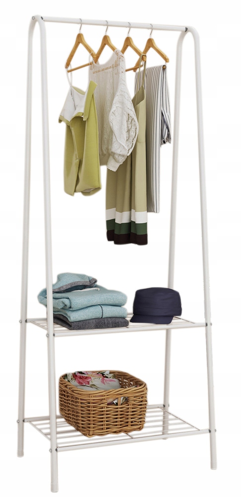 Вешалка для гардероба в современном минималистском стиле. Идеально подходит дома в качестве вешалки для одежды в гардеробной, в качестве вешалки в прихожей для курток гостей или в ванной комнате. вешалка б>. Его судьба зависит от вас. Вешалка оснащена верхней штангой и двумя полками в нижней части. Сборка вешалки чрезвычайно проста и не требует использования инструментов. Современный дизайн делает вешалку подходящей для любой квартиры или коммерческого помещения.
