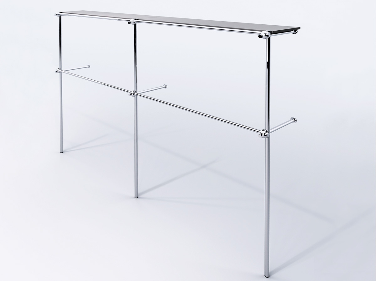 Вешалка настенная, изготовлена из стальной хромированной трубы диаметром 25 мм, соединительные элементы хромированные, ножки из черного пластика и полки из мебели. доска, толщина. 18мм.