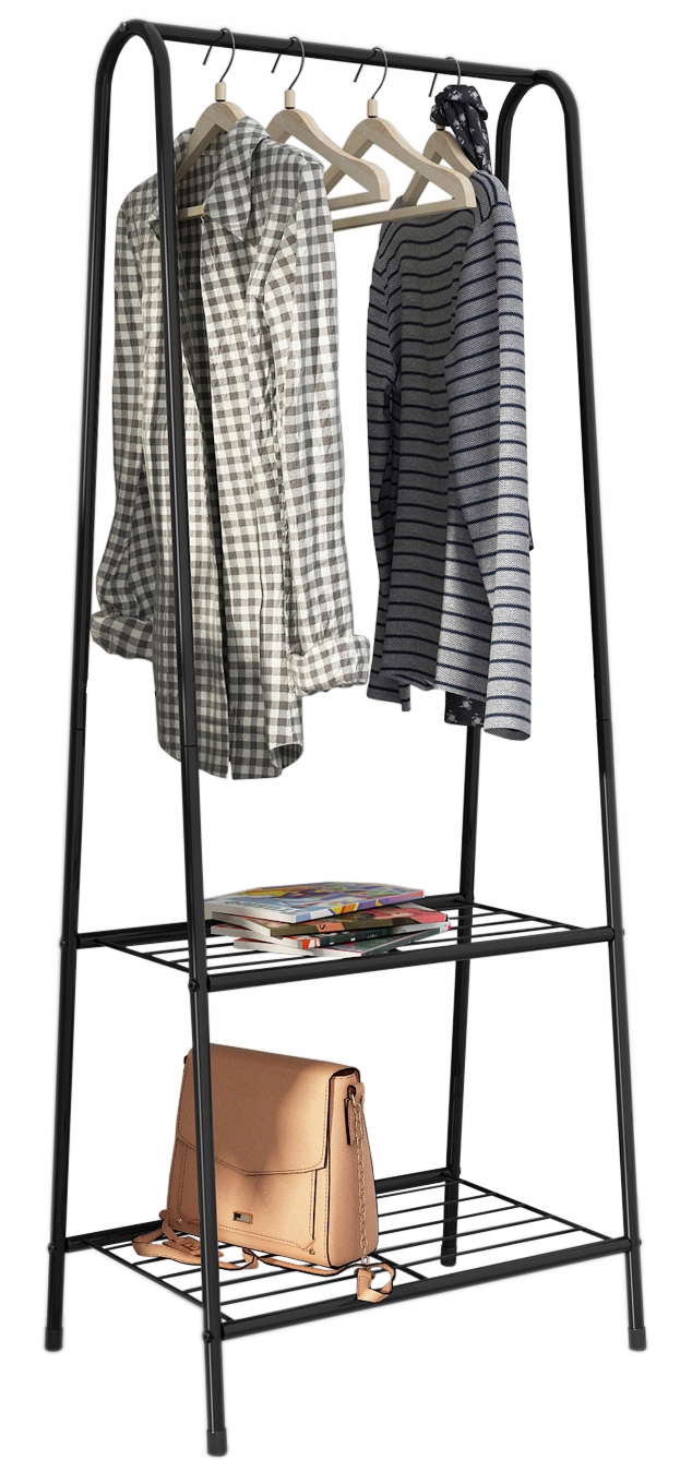 Вешалка для гардероба в современном минималистском стиле. Идеально подходит дома в качестве вешалки для одежды в гардеробной, в качестве вешалки в прихожей для курток гостей или в ванной комнате. вешалка б>. Его судьба зависит от вас. Вешалка оснащена верхней штангой и двумя полками в нижней части. Сборка вешалки чрезвычайно проста и не требует использования инструментов. Современный дизайн делает вешалку подходящей для любой квартиры или коммерческого помещения.