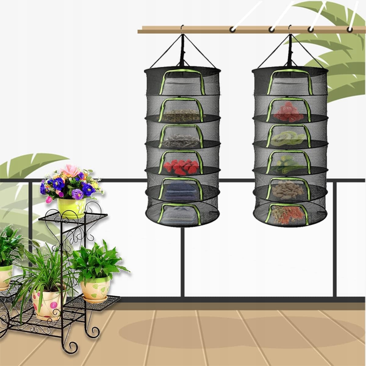 🍀 【Дышащая и прочная】 Сетчатая полка изготовлена из дышащего нейлонового материала с отверстиями. соответствующих размеров, благодаря чему растения остаются равномерно сухими. Каждый слой имеет встроенное гибкое стальное кольцо, которое обеспечивает надежную поддержку и не деформируется даже при длительном использовании.