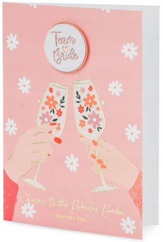 - Центральным элементом этой открытки является булавка с надписью «Команда невесты», что является не только оригинальным дополнением, но и уникальным символом поддержки и дружбы для невесты. Размеры этой булавки примерно 3,5 х 3,5 см. Ее можно отсоединить от открытки и прикрепить к близким друзьям невесты, что позволит им выделиться в этот особенный день