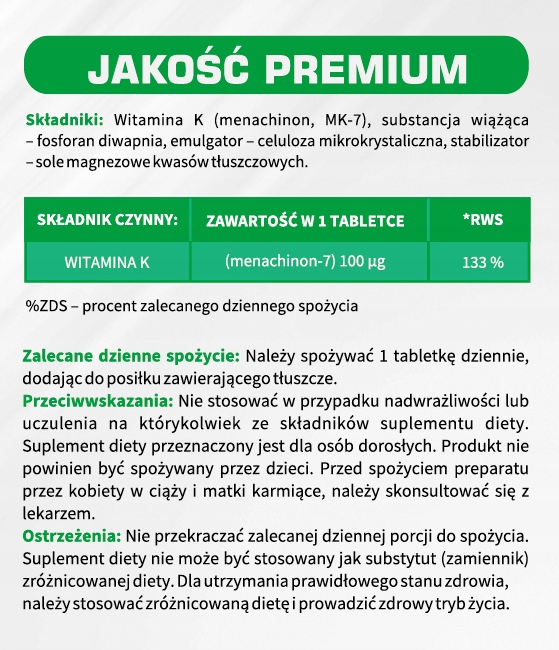 Ингредиенты: витамин К (менахинон (Mk-7)) с соевым Natto, связывающим веществом связывающим веществом-дивпосфатным микрокристаллином стабилизатором-стабилизатором-магравинными солями жирных кислот. (рекомендуемое ежедневное потребление).