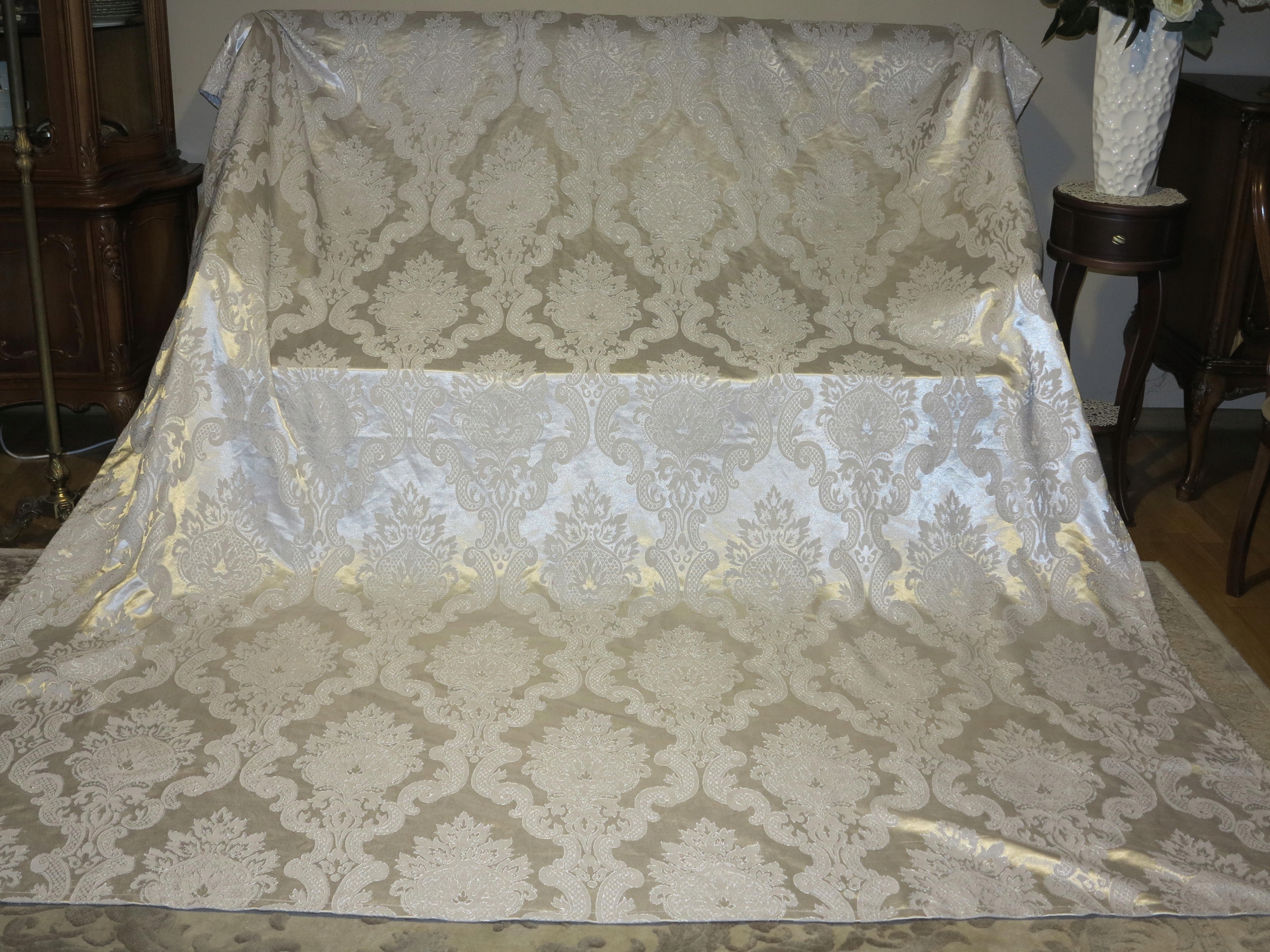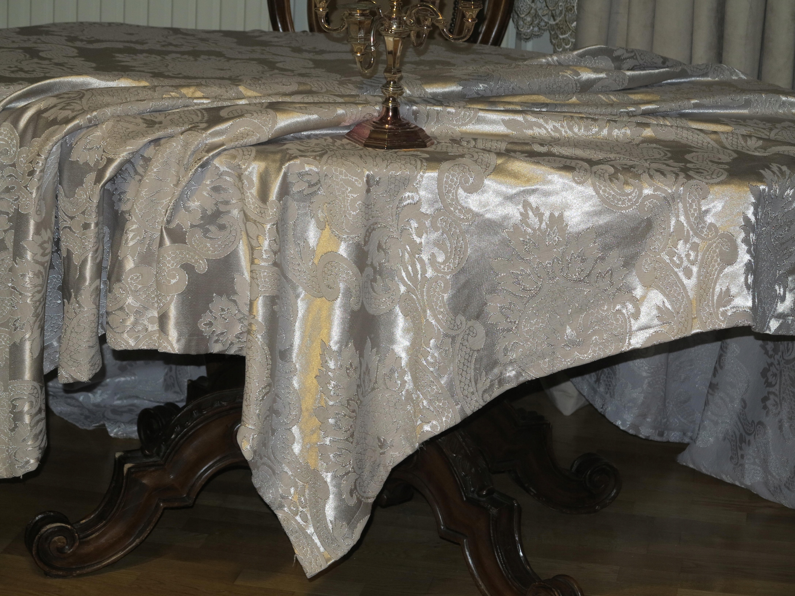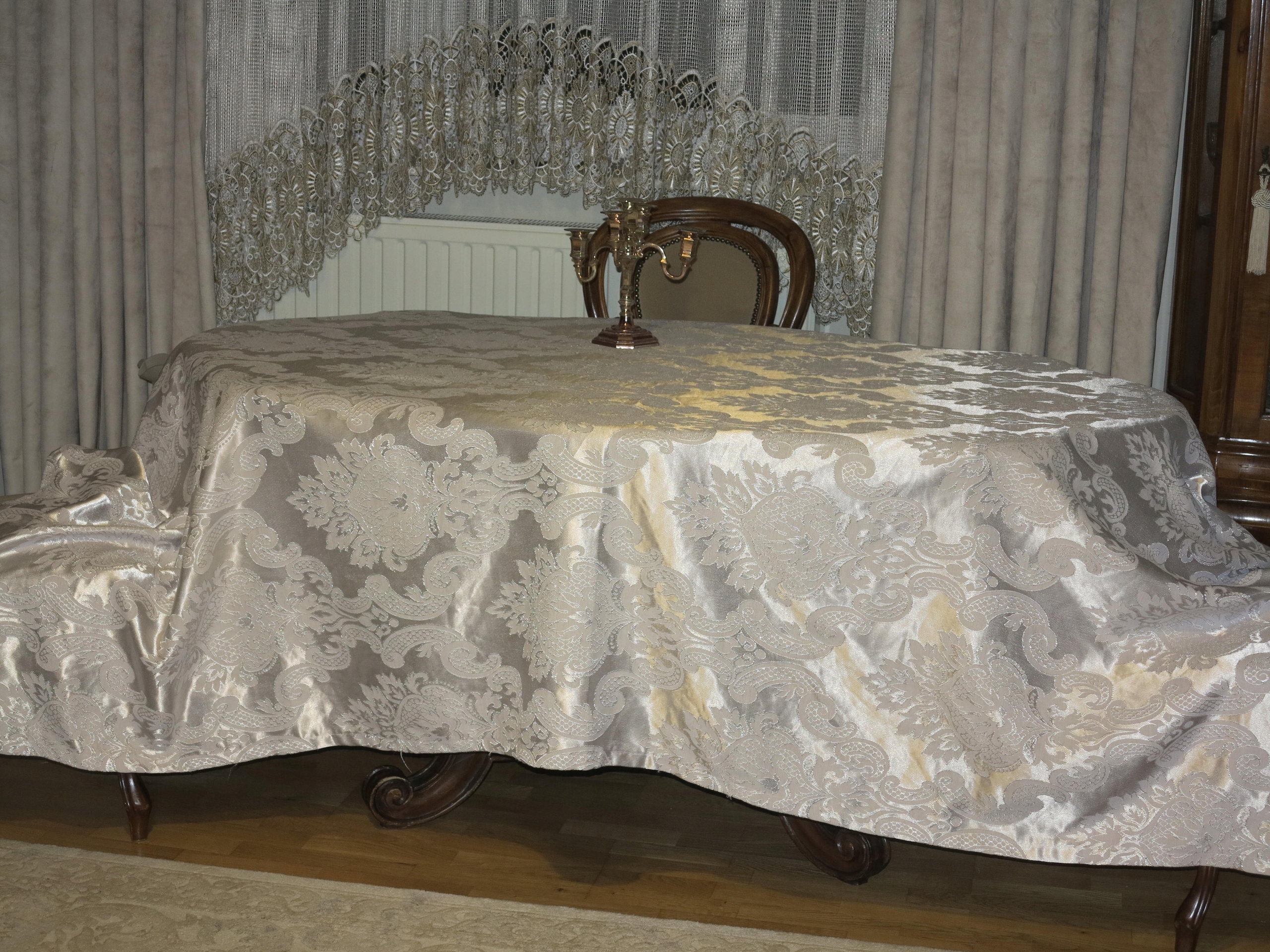 Тема аукциона - это Чрезвычайно красиво серебряный покрывал или огромная скатерть, в стильном узоре. Он имеет размеры: 264/233 см. Используется, в супер хорошем состоянии и качество. Я рекомендую, отличное украшение стильного интерьера