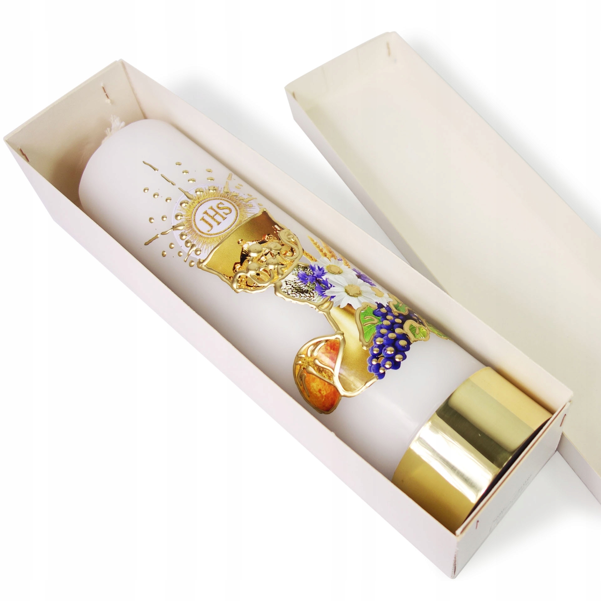 Мы предлагаем чрезвычайно красиво оформленный евхаристический мотив свечи алтаря для нефтяной вставки. Такая свеча может быть отличным даром по случаю святого причастия. Свеча белая, сделанная из парафина. Включает регулируемую масляную вставку с хлопковым фитилем.