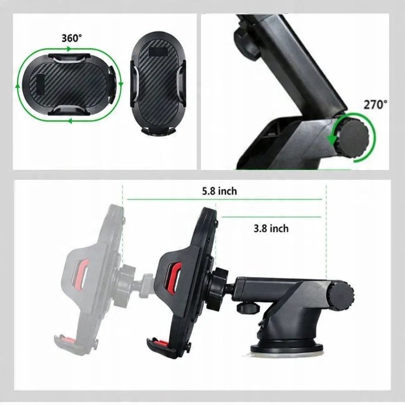 Практический автомобильный держатель для лобового стекла или кабины. Благодаря соответствующей конструкции, это позволяет вам удобно заряжать телефон благодаря доступу к зарядке. Ручка состоит из нескольких частей, поэтому легко устанавливайте его под соответствующими углами до 360 °