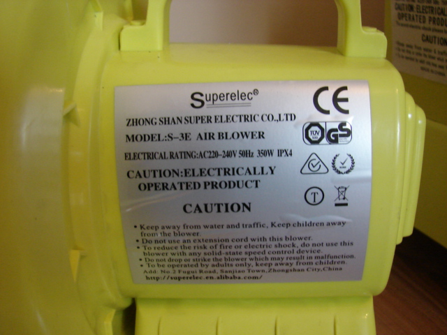 230 В, 350 Вт. Устойчивая к атмосферным воздействиям пластиковая конструкция. В комплект входит рукав для надувания шариков.