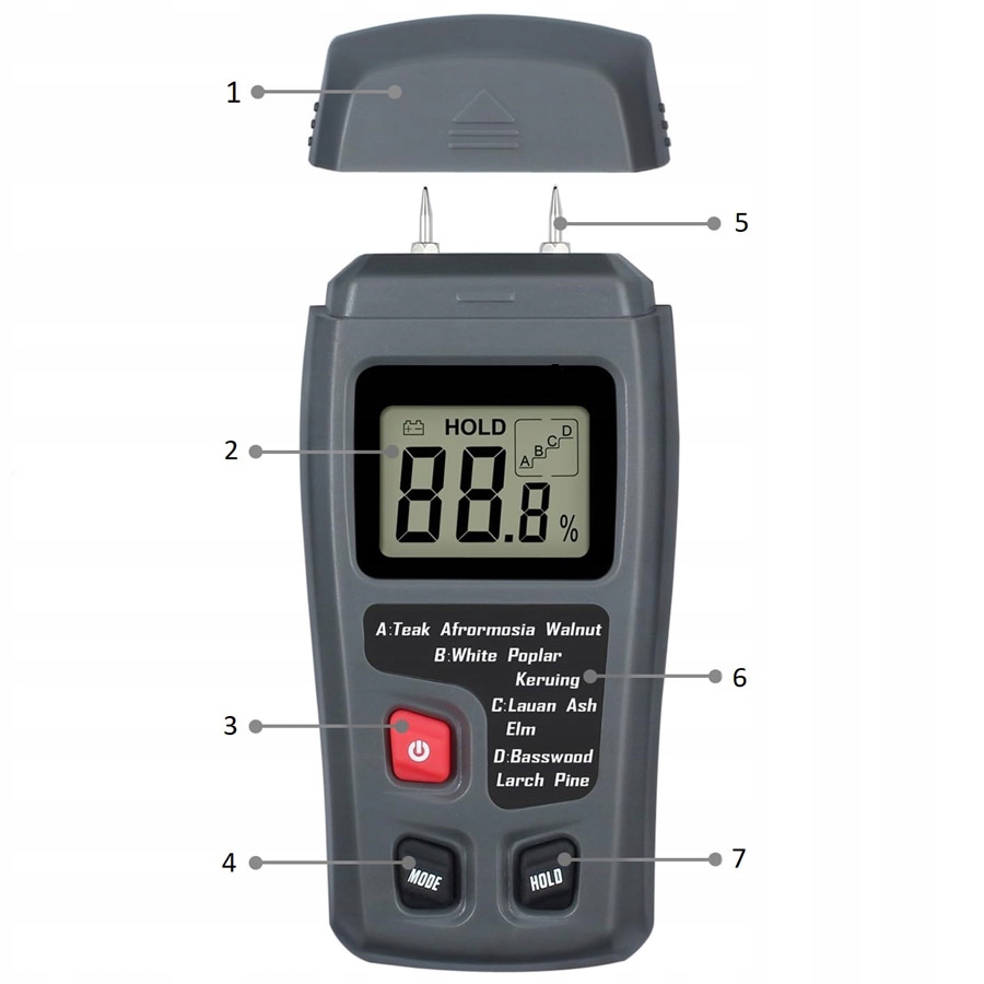 Влагомер оснащен 4 режимами (A,B,C,D), соответствующими: