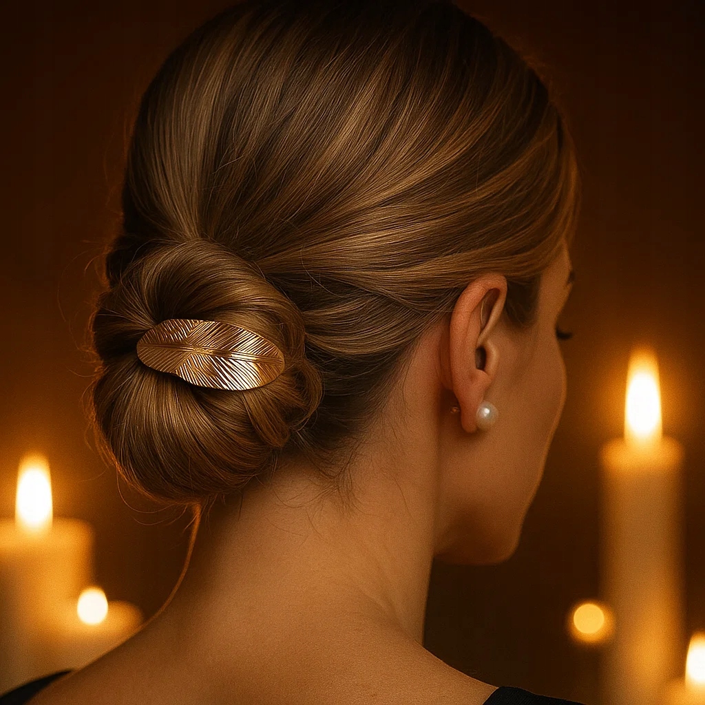 металл или позолоченный лист дает ему элегантный характер , в то же время тонко диверсифицируя даже самую простую прическу.
