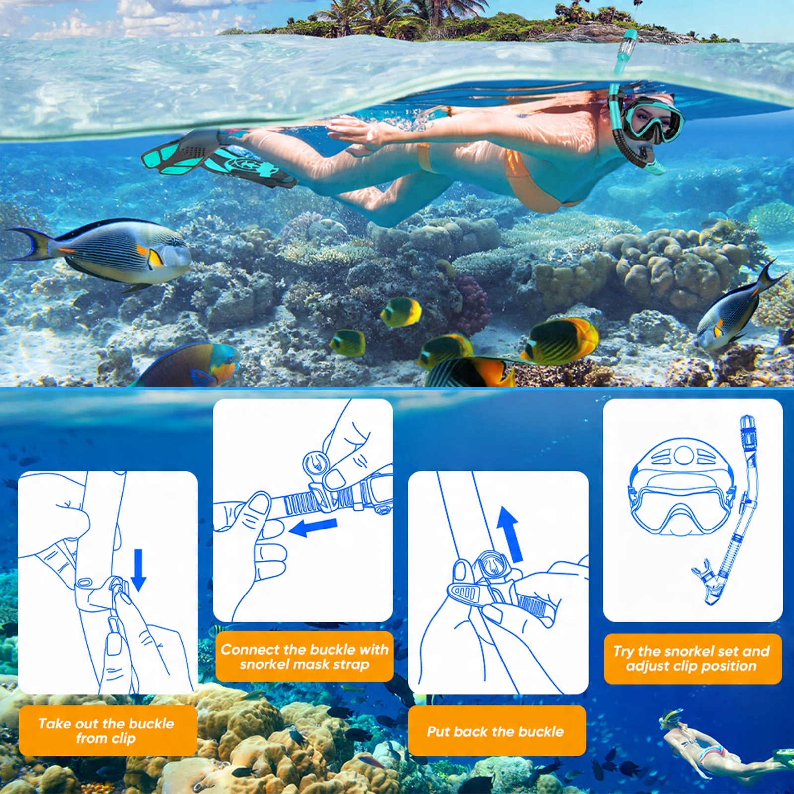Установите маску и стекалы для дайвинга и трубку для сноркелинга + плавники