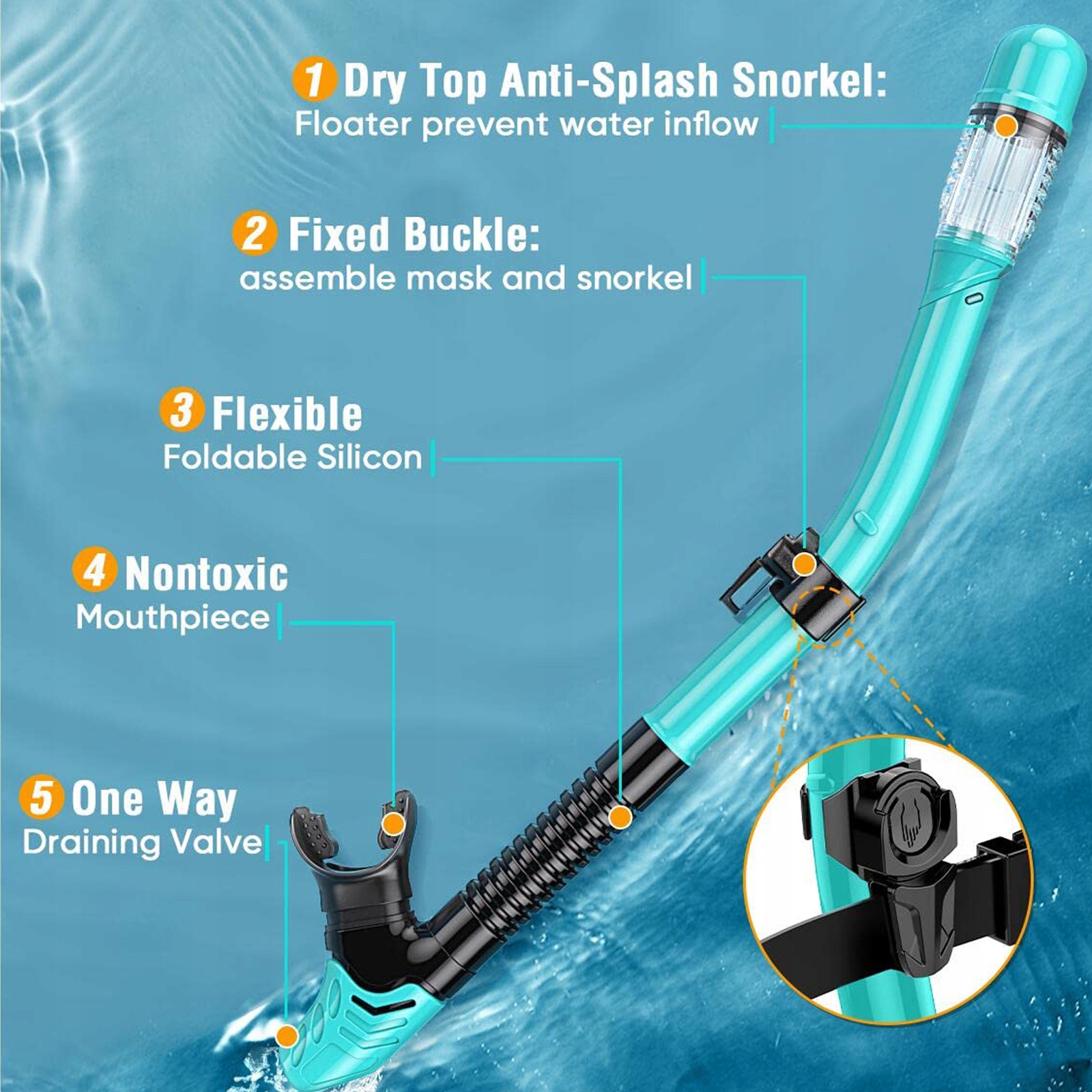 Складной набор для дайвинга с сухой трубкой: трубка, изготовленная из высококачественного силиконового вентиляционного клапана, гибкая трубка с системой таковой góra, которая предотвращает воду, так что вы можете дышать под водой без каких -либо проблем. Мундштук имеет эргономичную форму, которая обеспечивает комфорт. Мундштук остается удобным даже после долгого времени.