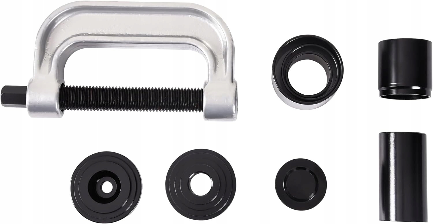 Приспособление предназначено для монтажа или демонтажа запрессованных элементов, таких как шаровые опоры, пальцы тормозных колодок и т.п. Инструменты изготовлены из литого материала. железо и закаленная углеродистая сталь. Весь комплект упакован в прочный пластиковый чемодан.
