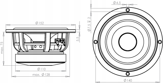 - Медный колпачок на центральном полюсе для уменьшения индуктивности звуковой катушки и минимизации изменений индуктивности звуковой катушки в зависимости от положения звуковой катушки.