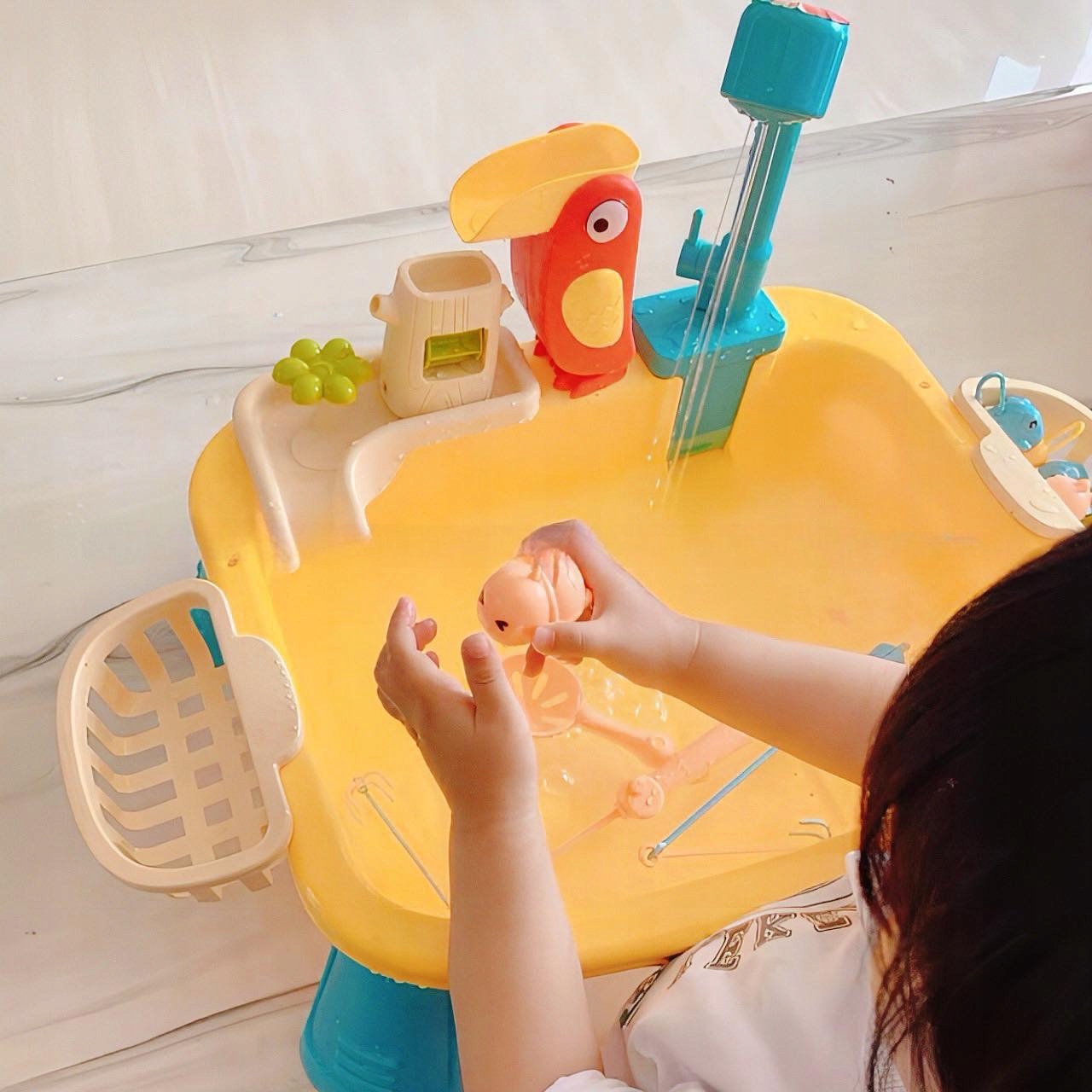 Функция игры в рыбалку — это обнадеживающее разнообразие повседневных игр на воде. После того, как посуда будет вымыта, раковина может превратиться в фонтан с островом и плавающей рыбкой! Дети могут научиться концентрации и ловкости, ловя рыбу с помощью специальных удочек.
