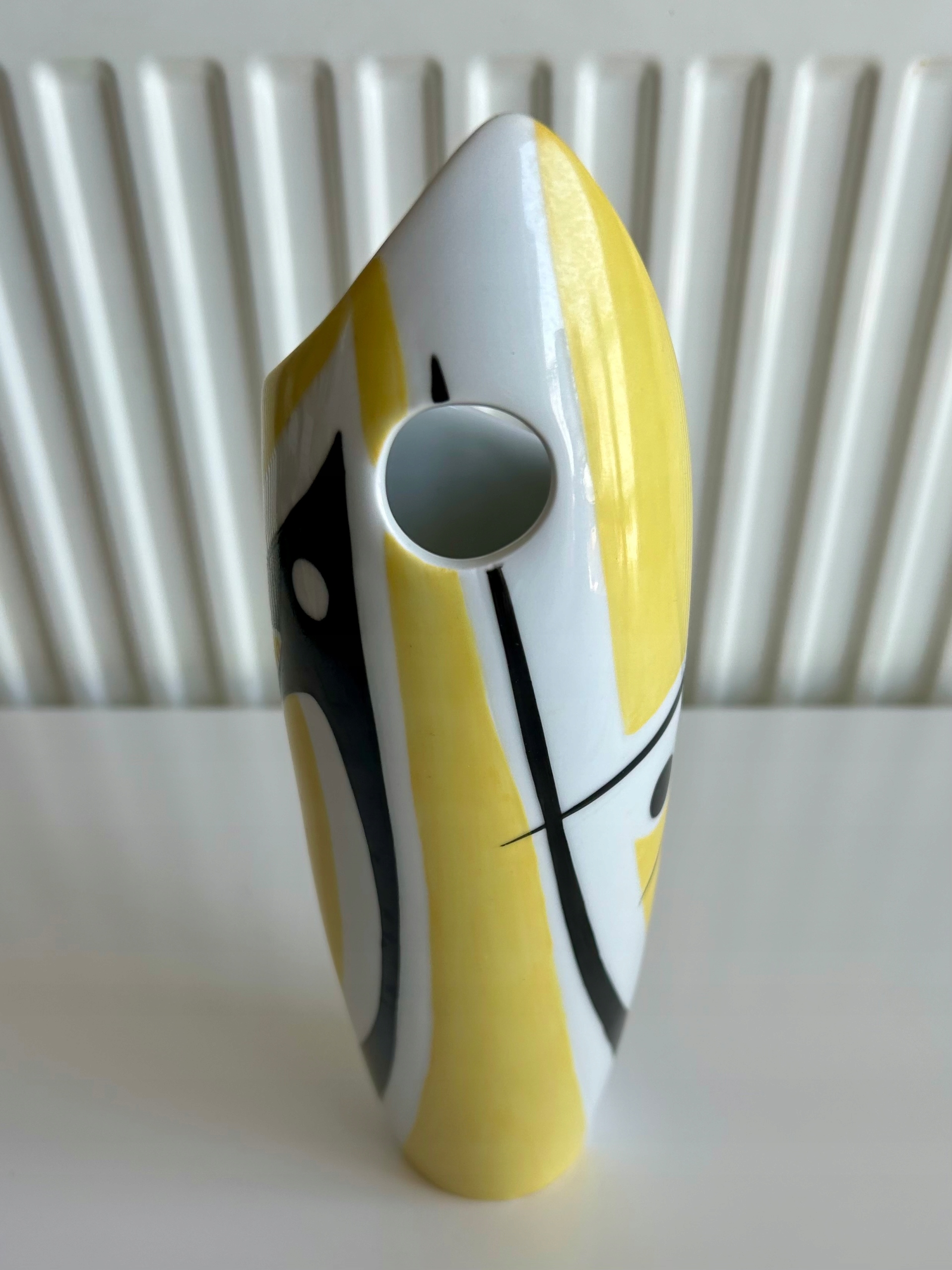 Красивая фарфоровая ваза середины 20 века от знаменитой венгерской фабрики Zsolnay. Дизайн Янош Тёрёк (1932-1996), известный венгерский художник-керамист и скульптор. Образец великолепного дизайна 1960-х годов, напоминающего проекты Цмелева или Вавеля.