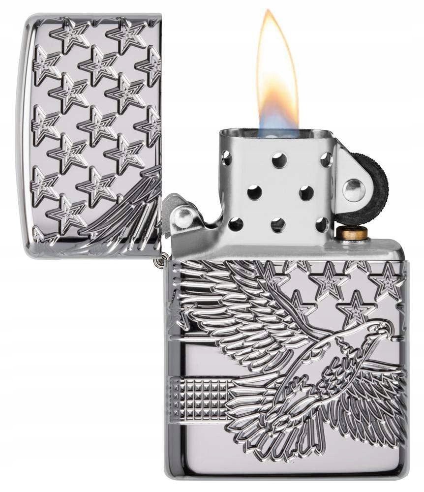 pateriac. Design - это серебристое зажигалка из коллекции с высокой польской хромированной коллекцией с гравированным рисунком орла и американским флагом, который оборачивается вокруг более легкого тела. Поскольку получает модель из коллекции брони, более легкое тело имеет мягко утолщенные боковые стены , что делает более зажигалку немного шире и тяжелее классической версии . Эта модель упакована в подарочную коробку .