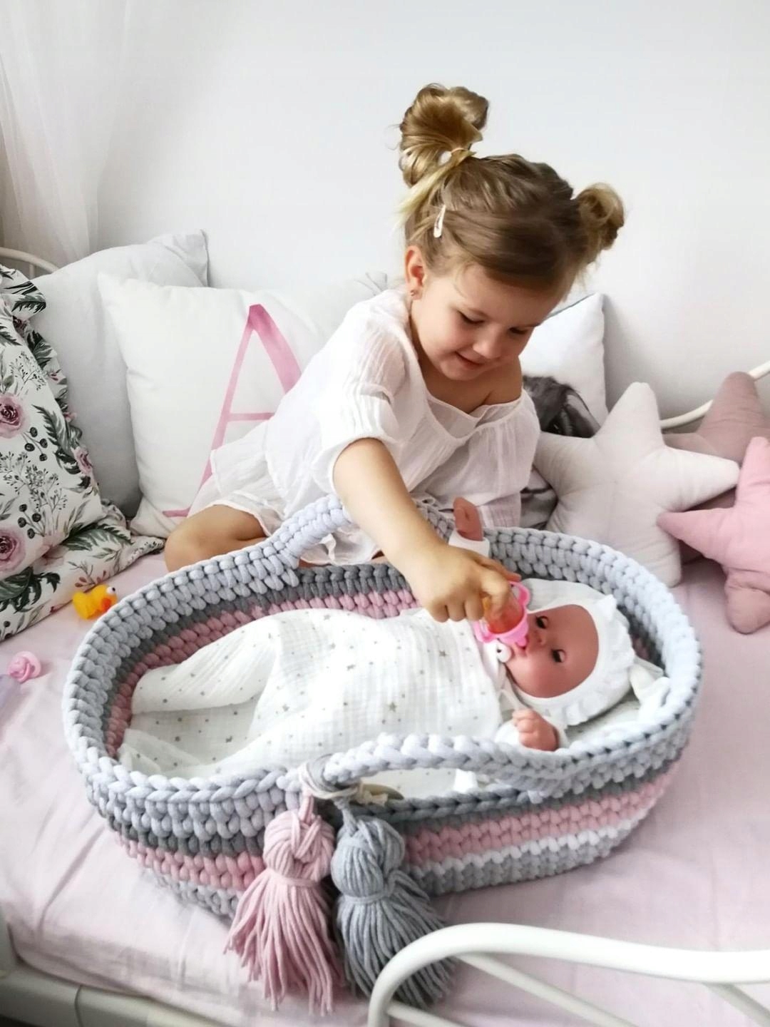 Moses Basket с качающейся версией для кукол - это отличное предложение для старших братьев и сестер, чтобы подготовить их к появлению нового члена семьи. Идеальный день рождения, для праздников или по случаю детского дня