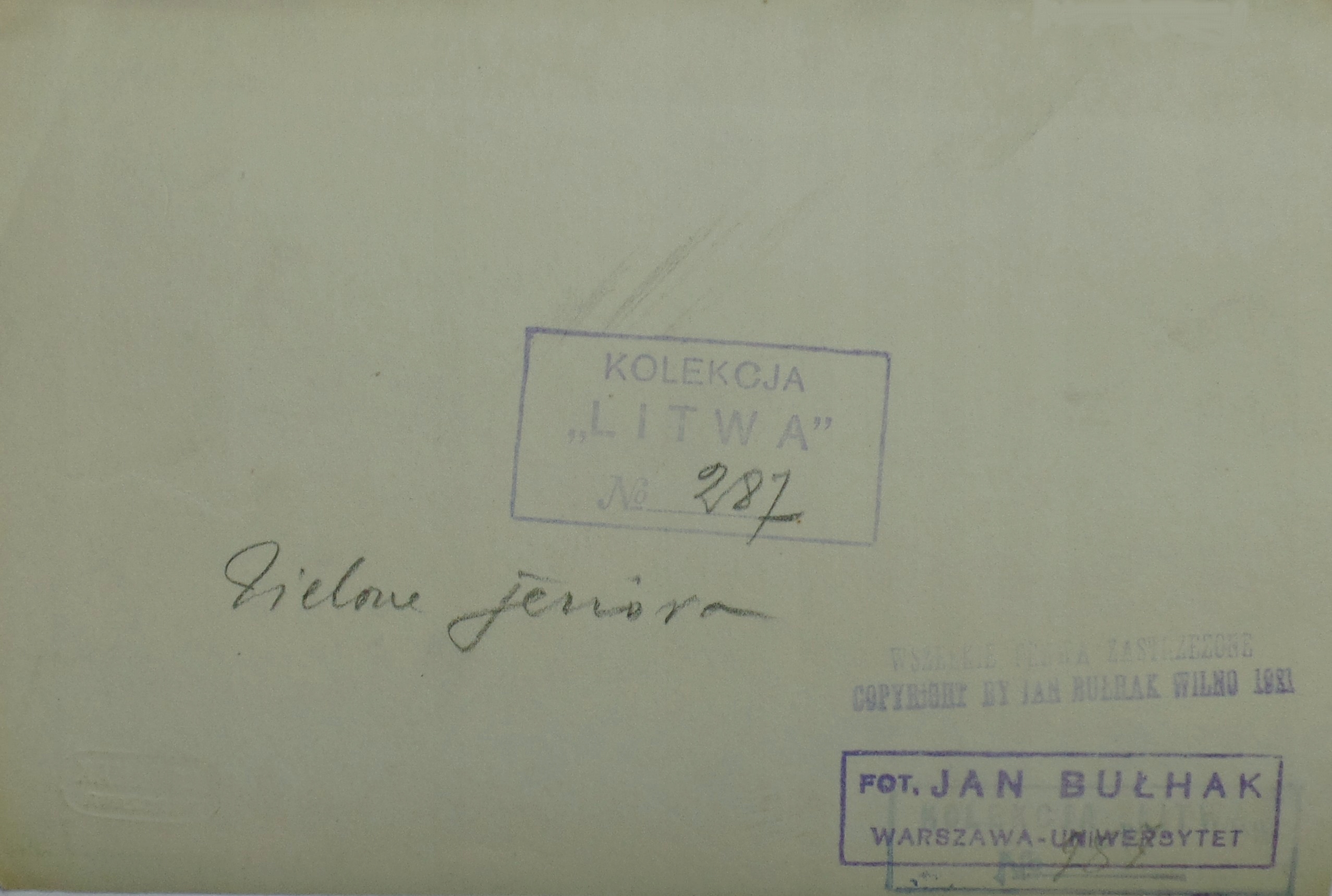 Ян Булгак (1876 -1950) «Зеленые озера», фотография сепия, бром, формат бумаги. 11,5 х 16,5 см. На реверсе марка «Литовская коллекция» с написанным карандашом номером «287», подпись автора карандашом, штампы — автор и оговорка об авторских правах. Дополнительно в южном углу — сухая марка и еще одна марка Литовской коллекции. с номером.