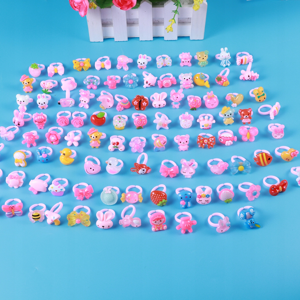 В упаковке 100 мультяшных колец разной формы и разных цветов, таких как цветы, животные, фрукты и так далее. Они изготовлены из первоклассного материала, который нелегко сломать. Изысканный дизайн и мастерство исполнения делают его уникальным и неповторимым. Нарядите аксессуары для костюмов и сделайте их более очаровательными. Прекрасный выбор в качестве подарка детям.