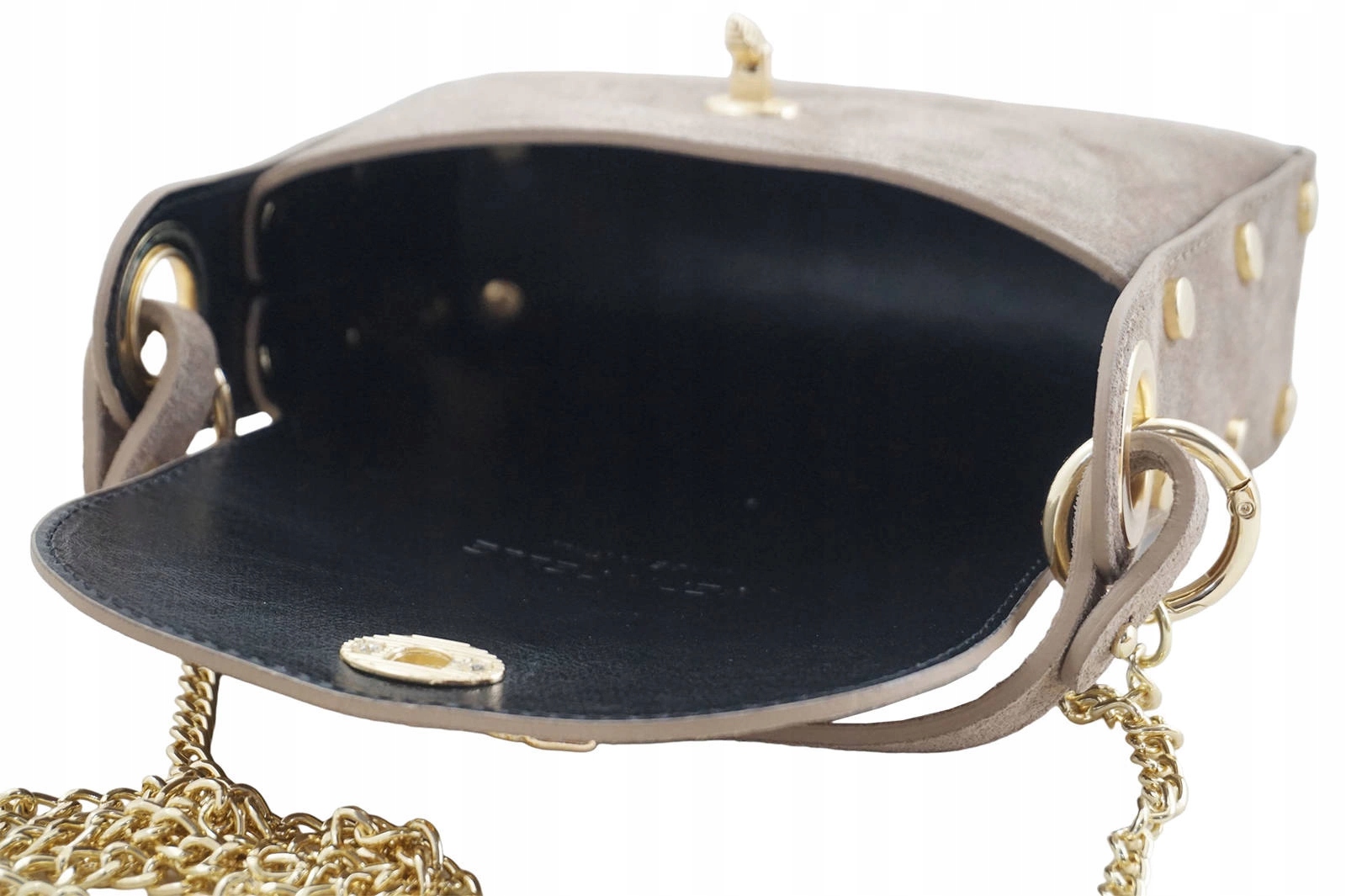 Внутренний вид сумки:модный. Замшевые деловые сумки с декоративной застежкой и золотыми заклепками однокамерные, необработанные. Имеют золотую фурнитуру, короткую ручку (длина 25см, высота 11см, ширина 1,8см) и прикрепленную золотую цепочку (длина 110см, высота 58см). Универсальная конструкция, идеальная по размеру для размещения необходимых вещей – телефона, кошелька и мелкой косметики.