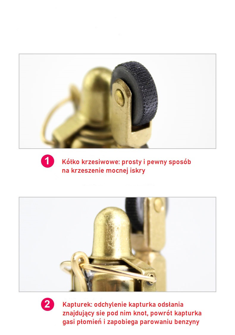 Двуручная бензиновая зажигалка - чтобы зажечь ее, возьмитесь за внешнее кольцо одной рукой и с помощью кольца внизу переместите внутренний корпус зажигалки вниз другой рукой, что откроет колпачок, затем используйте кремень кольцо для высекания искр, которые зажгут фитиль, смоченный бензином.