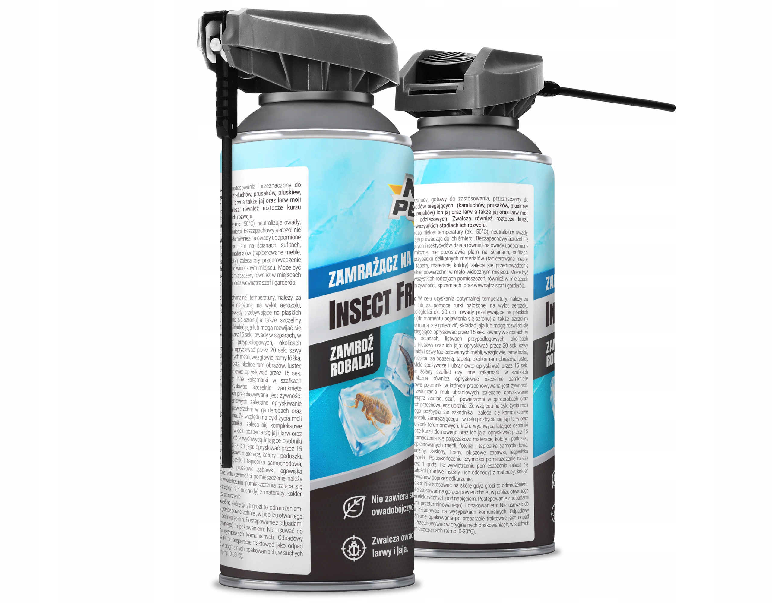 Спрей работает при очень низкой температуре (около -45°C), которая немедленно нейтрализует насекомое и через короткое время убивает его. Замораживание насекомыхубивает взрослых насекомых, а также уничтожает яйца, например, клопов.