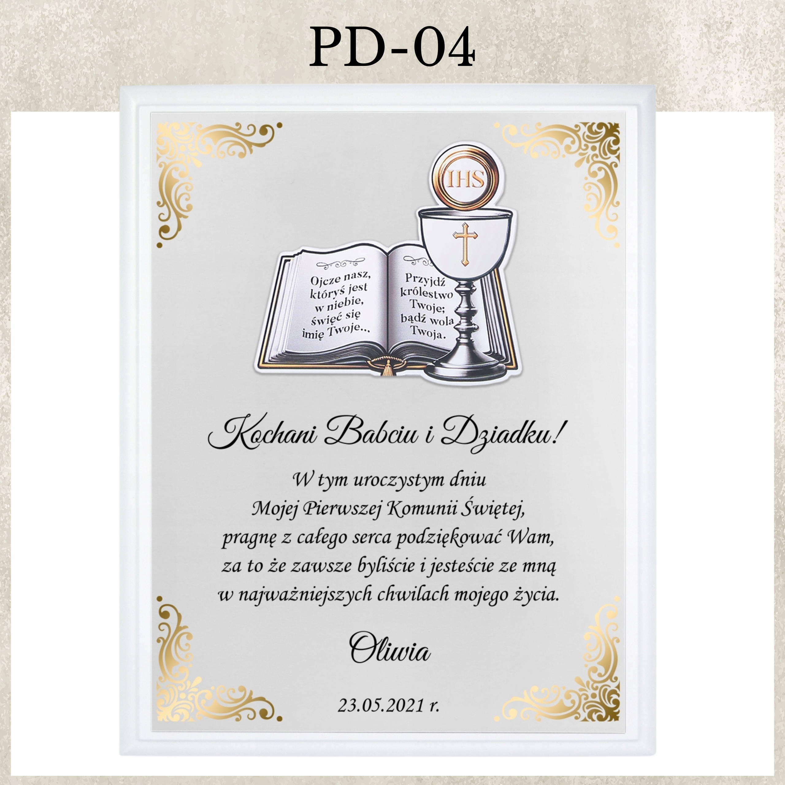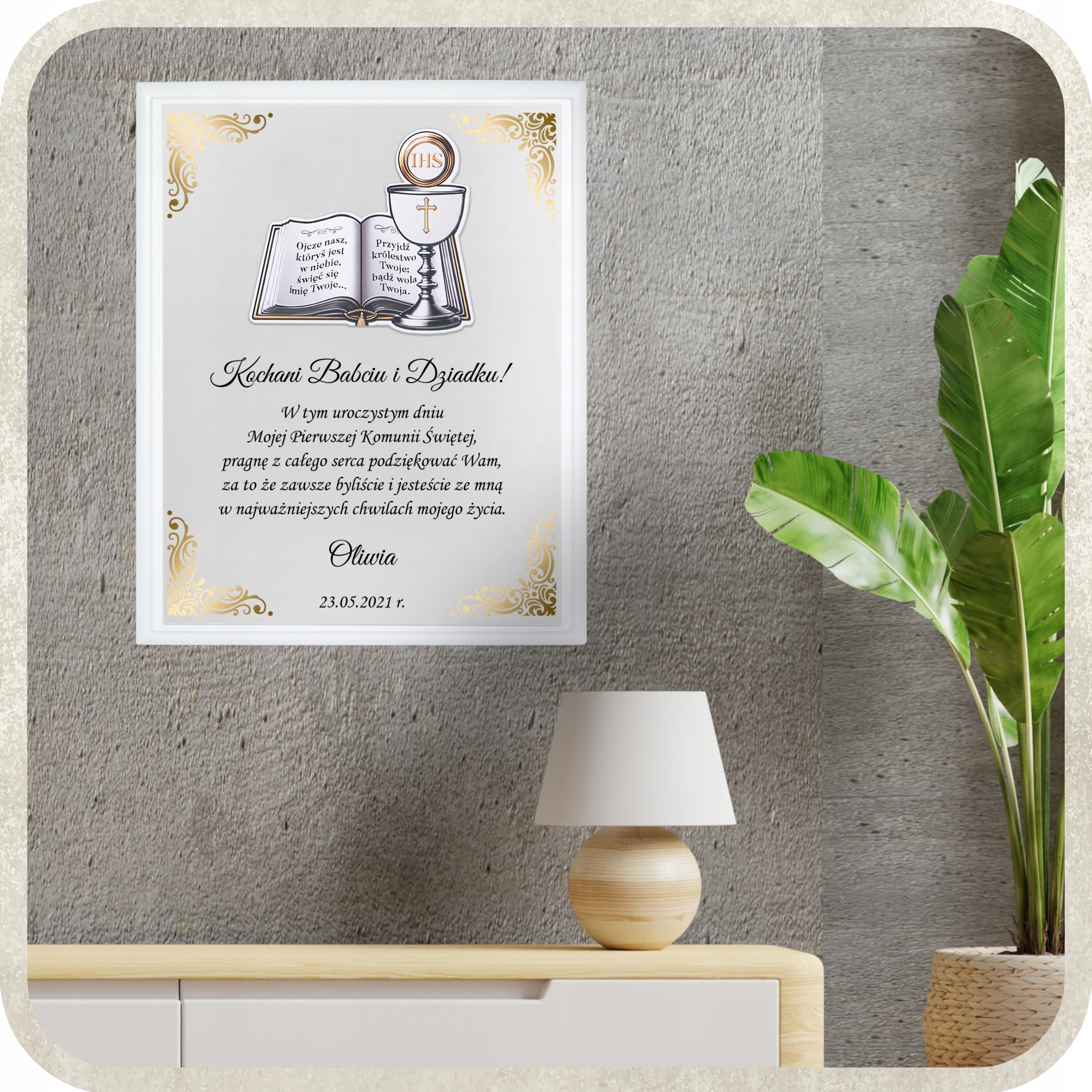 Элегантная панель на солидном фонде MDF является уникальной благодарностью перед крестными родителями, бабушкой и дедушкой за сопровождение ребенка в день получения таинства первого святого причастия.
