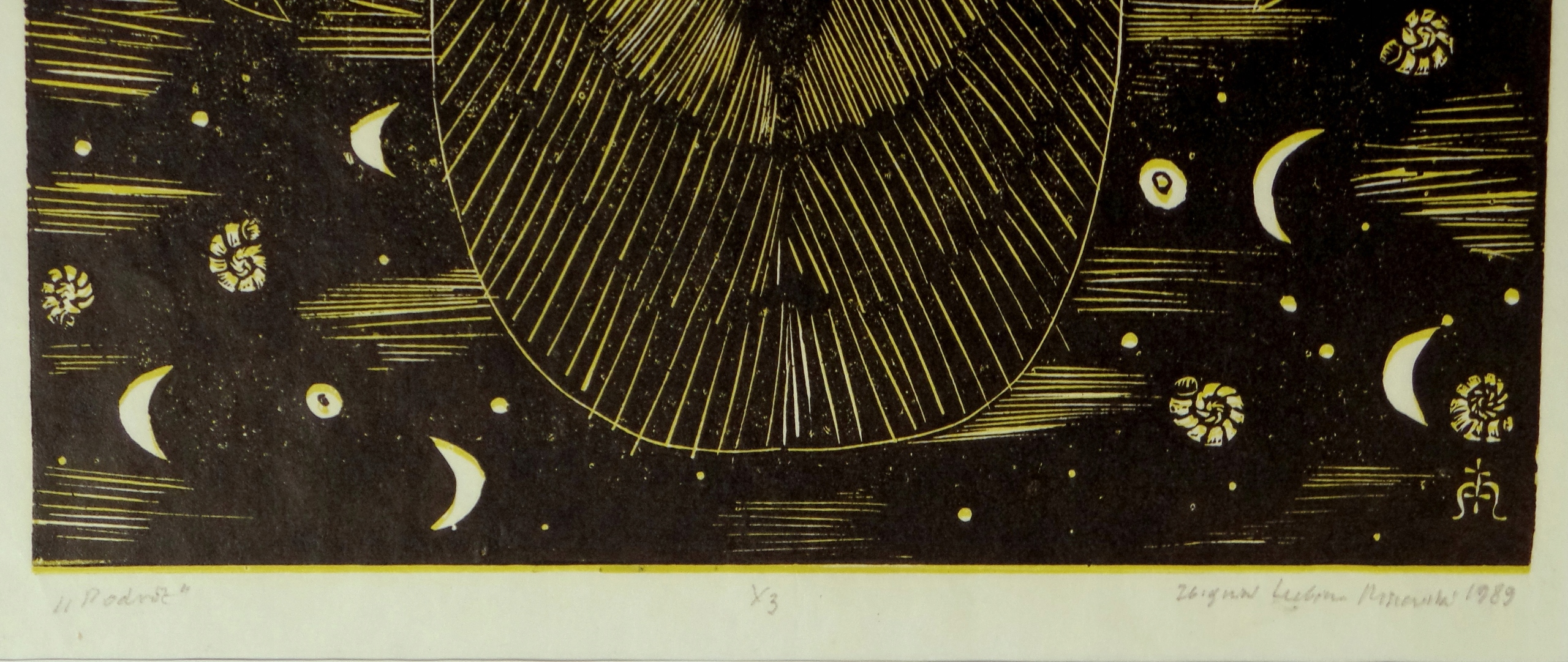 Збигнев Любич-Мишевский, «Путешествие» линогравюра на бумаге, размеры: 34 х 23 см, (размер тарелки 30 х 20,5 см). Работа описана, подписана и датирована карандашом под табличкой «Подруж» - художник-график, выпускник Академии художеств во Вроцлаве (1969). Член группы графических дизайнеров «RYS» и ZPAP. Живет и. работает в Тшебнице. Создает художественную и прикладную графику, является автором многих республиканских и зарубежных выставок.