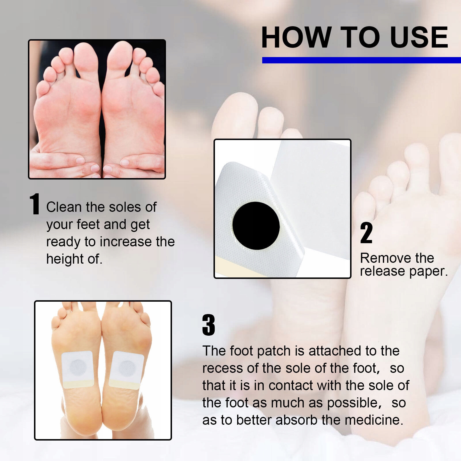 Особенность: рост гормонов в гипофизе отвечает за рост костей, состав тела и метаболизм. Срезис на ноге -это способ вызвать рост этих гормонов и может помочь в увеличении роста эффективным, здоровым, безопасным и естественным срезом на ноге богат различными растительными экстрактами, которые могут действовать на пружинах стопы, способствуют синтезу гормона роста в организме и обеспечивают синтез гормона роста. с водой; Откройте упаковку и снимите бумагу, покрывающую патч на ноге; 3. Нанесите патч на ногу непосредственно к точке стопы yongquan; 4. Поместите пятно на ногу и держите его в течение 8-12 часов, а затем удалите пятно после использования 5. После снятия пятна на ноге вымывайте размытую область теплой водой 6. Возьмите 2 таблетки в день, используйте только ночью во время сна. Используйте его в течение трех месяцев, чтобы получить наилучшие результаты.