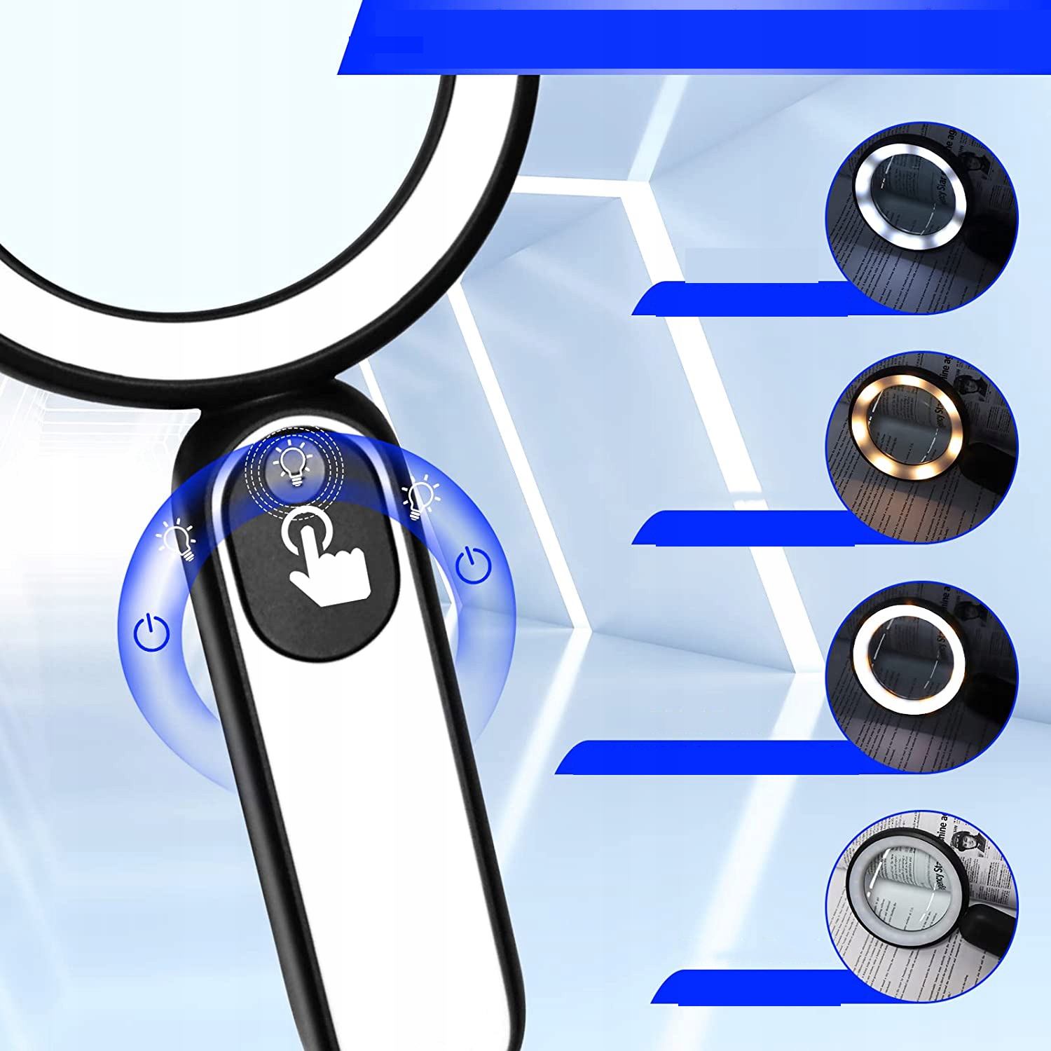 【21 светодиод и 3 режима освещения】: увеличительное стекло из 21 светодиода оснащено энергосберегающими светодиодами, которые обеспечивают хорошее освещение даже в условиях низкой освещенности и более удобны в использовании. В то же время лупа с подсветкой имеет 3 режима освещения (белый свет, теплый свет, теплый белый свет), которые можно вручную переключать в различных условиях освещения в соответствии с вашими потребностями, чтобы лучше защитить ваши глаза.