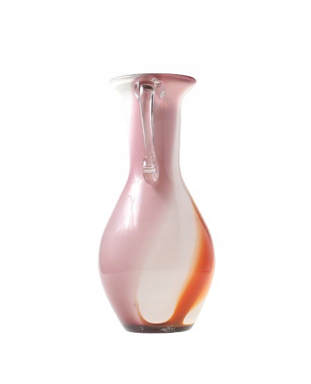 Ваза с ручками из трехслойного натриевого стекла: снаружи бесцветное, внутри слой молочно-белый, средний слой молочного, красного и баклажанового цветов. Уши бесцветные. Ваза произведена на Тарновецком стекольном заводе в Тарновце. Польское художественное стекло, 1980-1990-е годы.