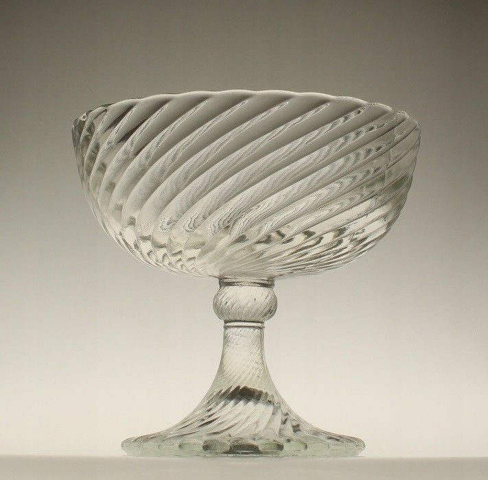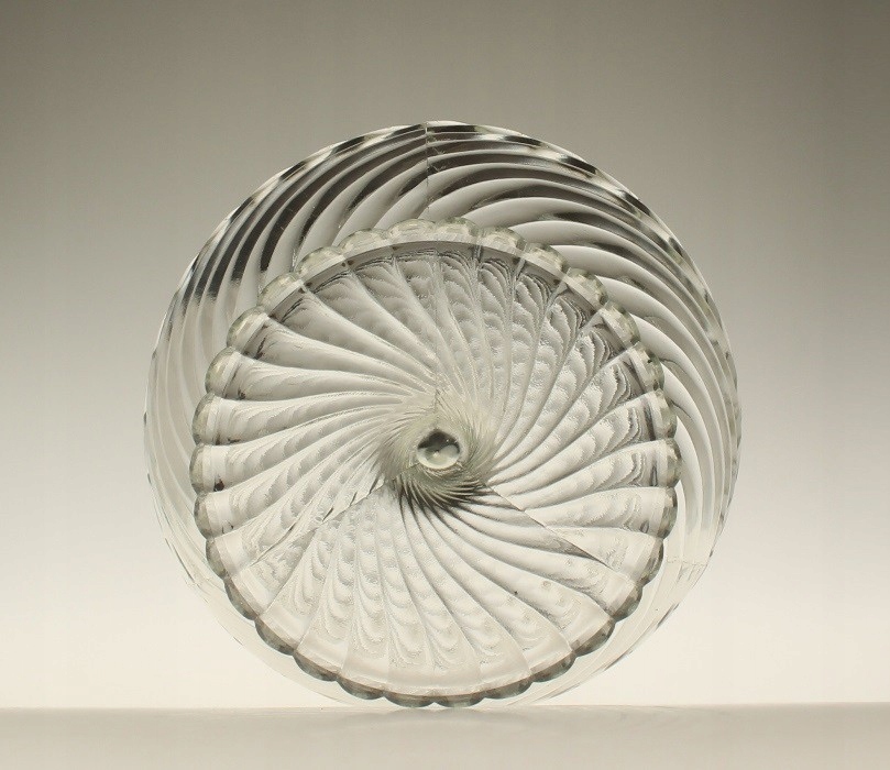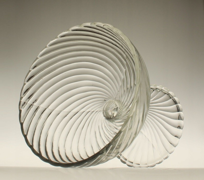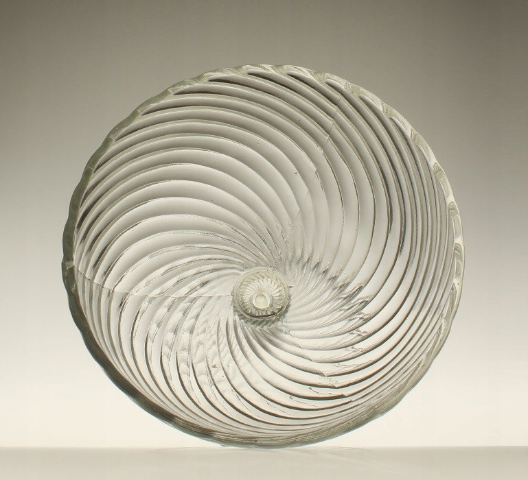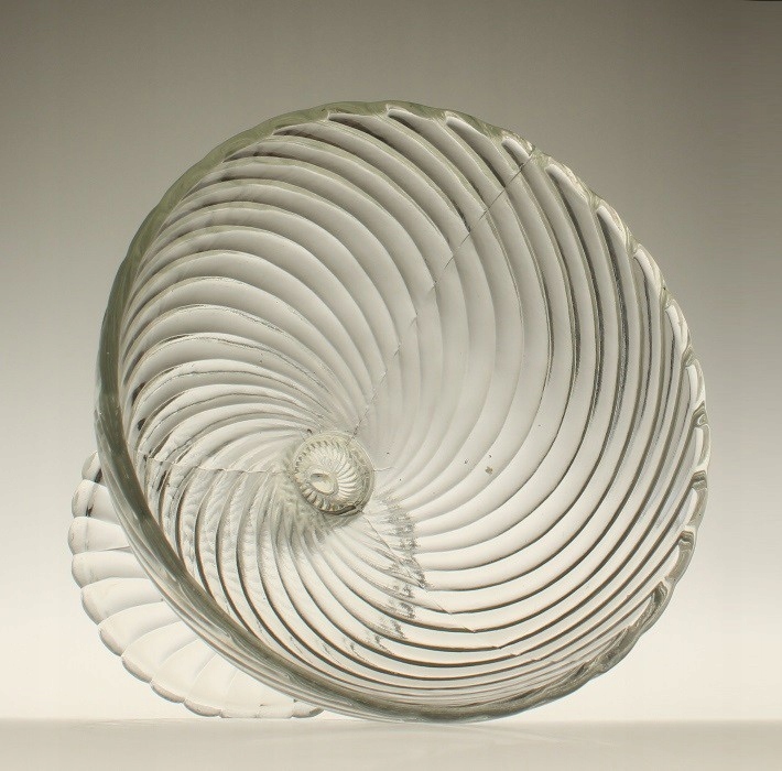 Фруктовая тарелка, бесцветное прессованное стекло. Дизайн Рышарда Сервицкого для Домашнего стекольного завода «Зомбковице» в Домбровой Гурнице. Модель из серии "Вир". 1970-е годы