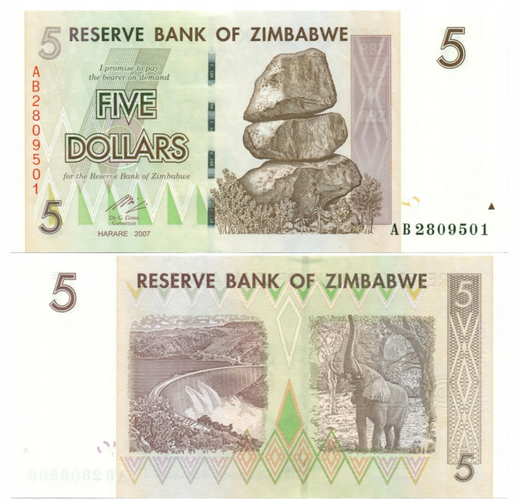 ЗІМБАБВЕ 5 ДОЛАРІВ 2007 P-66 UNC