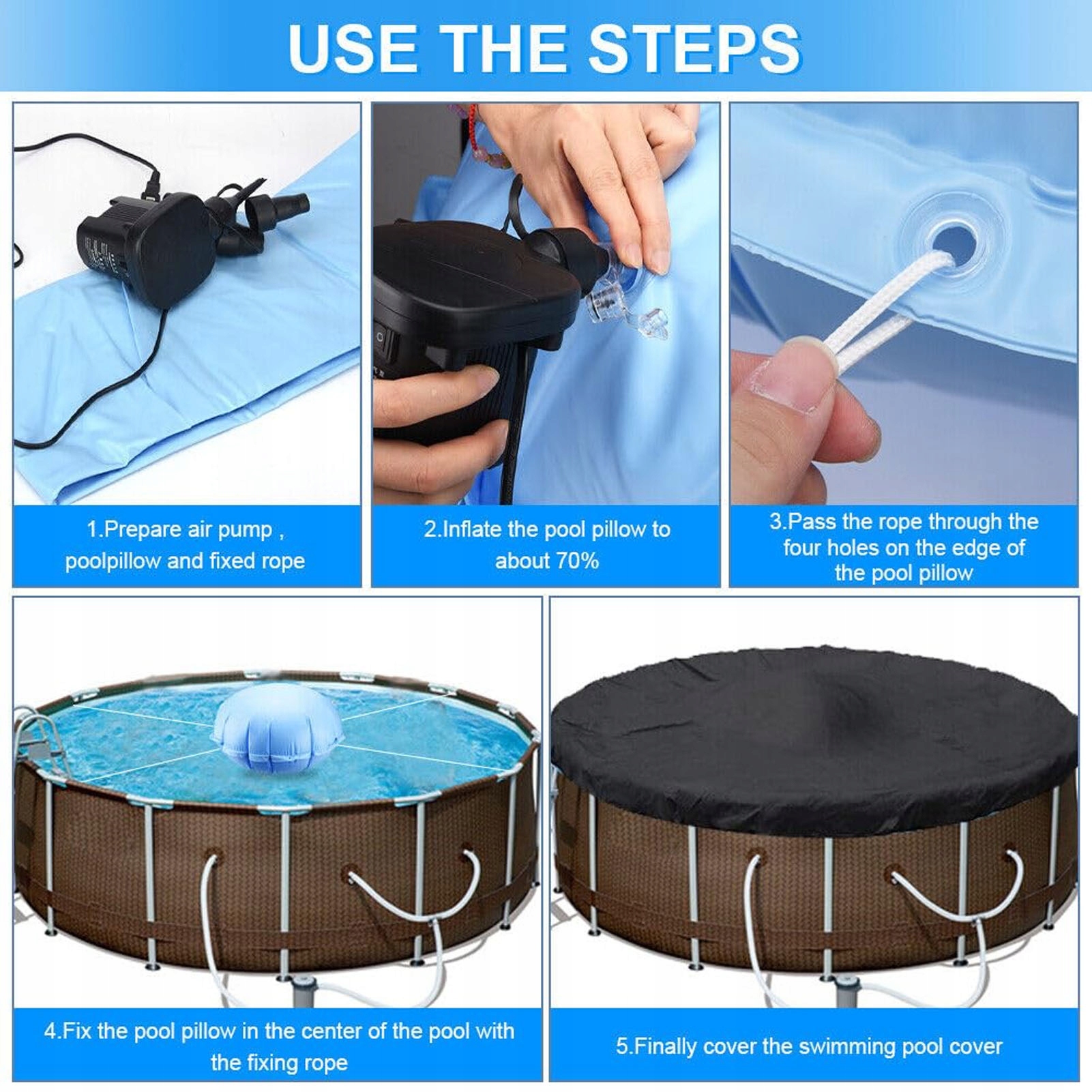 4. Легко в использовании: эта надувная вспашечная подушка очень оживленна для надувания и просто используйте насос или электрический воздушный насос для быстрого надувания. Затем проведите веревку через четыре отверстия на краю подушки в зимнем бассейне внутри бассейна для быстрой установки.