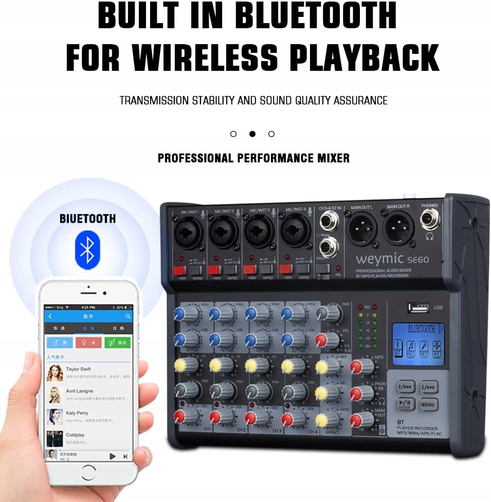 DJ MP3/USB вход, встроенный - в Bluetooth беспроводное соединение, совместимое для USB, Flash Reader, MP3. Подключите внешний USB, ПК, флэш -накопитель или устройство Bluetooth, чтобы микс и запись; Используйте встроенный контроль, чтобы воспроизвести/пауза, пропустите дорожки и переключатель между гривами Соединение микрофона/прибора, подходящее для домашнего KTV, полосой, событий кампуса, конференций и других случаев. Удар и ясность, без особых усилий достигает премиального качества кристально чистого студийного уровня качественного музыкального воспроизведения.