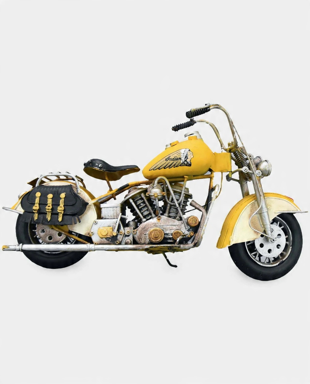 Большая винтажная модель, изображающая мотоцикл в стиле желтого индийского стиля, изготовленную из металла очень точно, с вниманием к наименьшим деталям. Модель производит отличное эстетическое впечатление и имеет вечный стиль. Подходит для многих интерьеров, как украшение или как интересная идея подарка.
