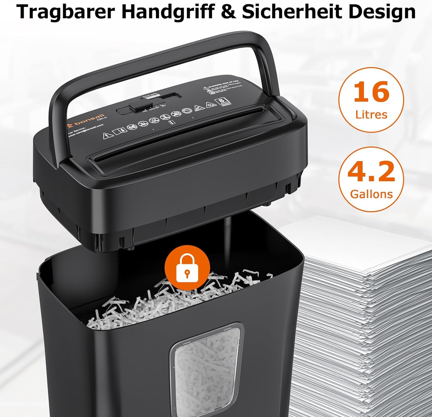 Корзина объемом 16 литров вмещает более 250 листов бумаги формата А4 и имеет большую емкость по сравнению с аналогичными измельчителями.