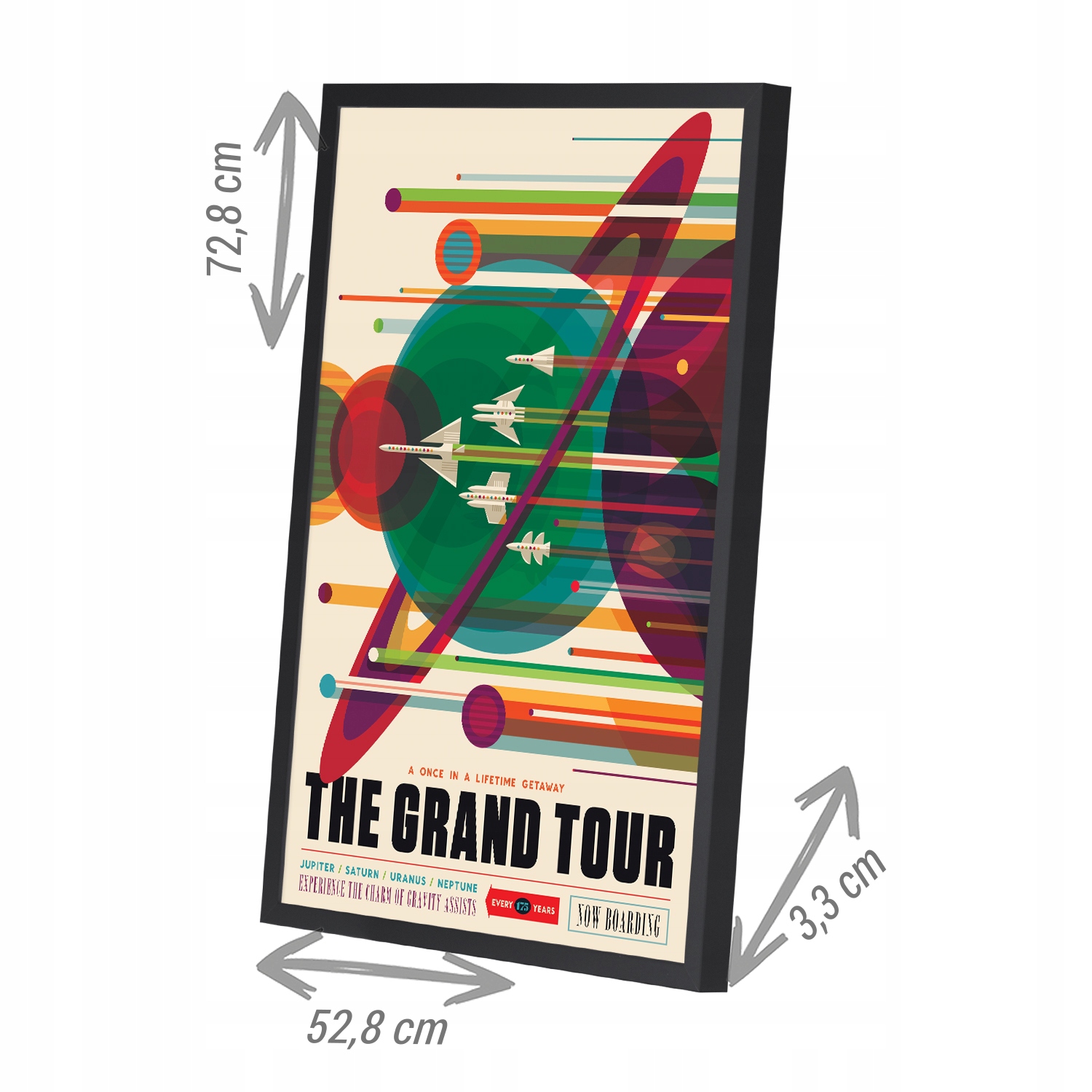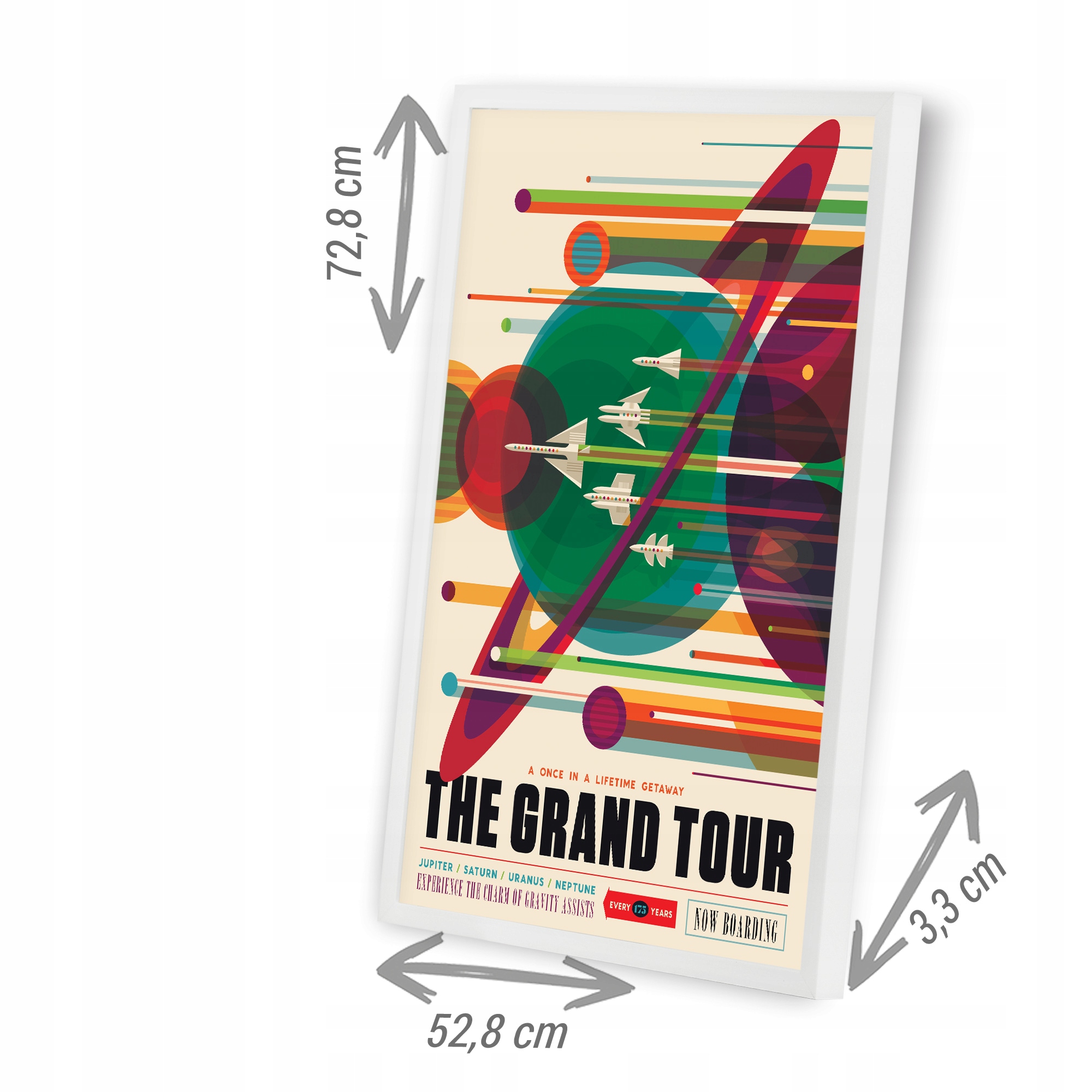 Гранд-тур — маршрут зонда "Вояджер-2", посетившего четыре внешние планеты: Юпитер, Сатурн, Уран, Нептун. Это было грандиозное путешествие по Солнечной системе, в котором гравитация каждой планеты использовалась для продвижения ее к следующему пункту назначения. Возможности для такого маршрута возникают примерно каждые 175 лет, когда внешние планеты (ориентированные вправо) выравниваются. Плакат со стилистической отсылкой к прозрачным накладкам 1960-х годов.