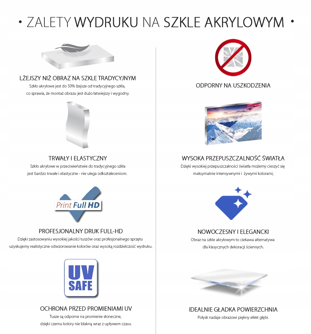 Изображения на акриловом стекле предназначены для поддержания всех преимуществ классической печати на стекле, но без его слабостей - хрупкость или высокий вес. Они приготовлены из одного из наиболее ценных материалов во внутренней архитектуре, метил -полиметакрилат. Этот полимер, как стекло, жесткое и бесцветное - Следовательно, его популярное название: Акриловое стекло . Как и стекло, он имеет очень высокую (достигающую более 90%) проницаемость света , а не обесцвечивает под воздействием ультрафиолетового излучения . Однако, в отличие от стекла, этот материал определенно является более легким (до половины!) И более долговечным : более гибким и устойчивым к дроблению. Печать на акриловом стекле помещается в виде фаната фольги. Благодаря этой технике наилучшим возможным качеством печати является сохранение , Фотографическая точность и насыщенные цвета . В то же время, шаблон получает интересную трехмерную глубину и тонкий глянец. и готовое изображение на стекле выглядит действительно уникальным !