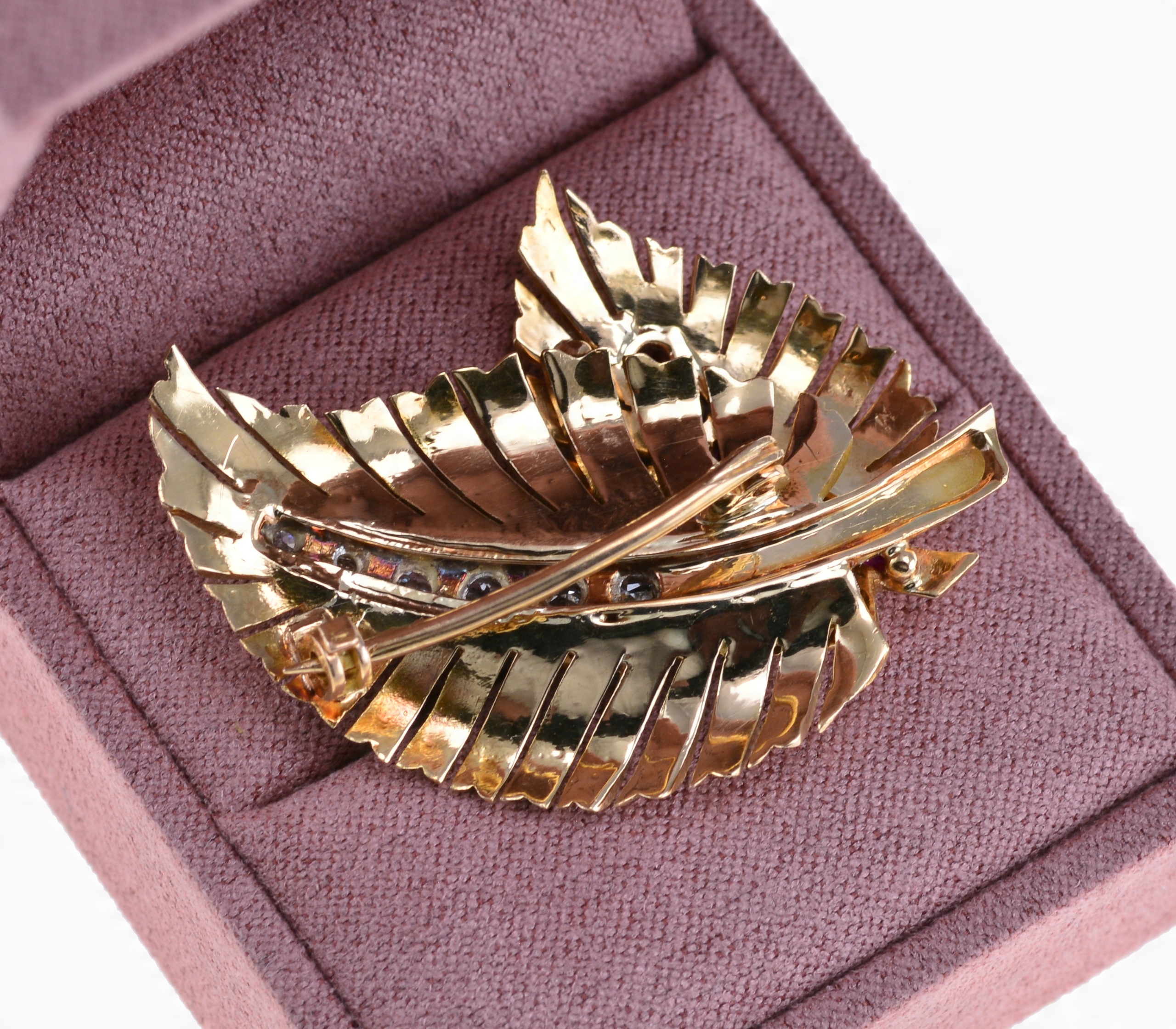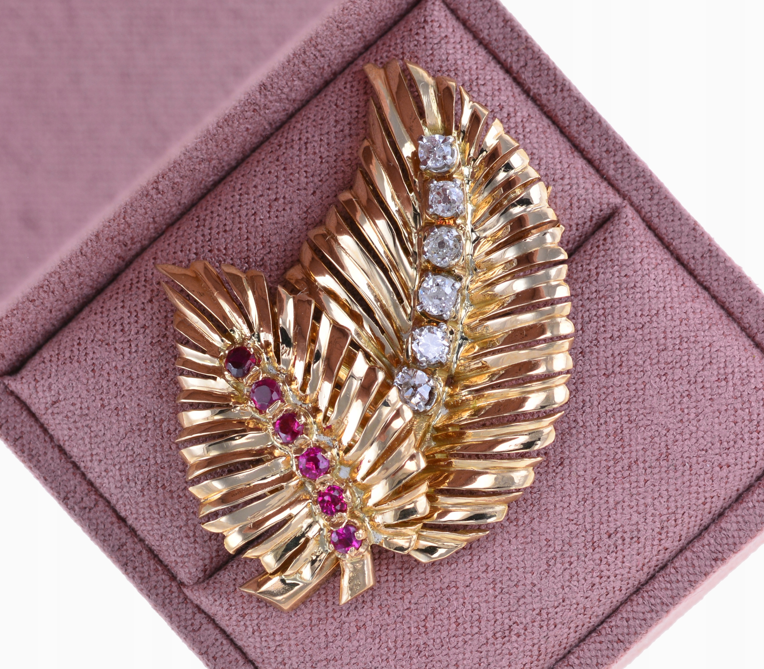 - Измерения 38x31 мм выше 18K. Брошь в виде двух пальмовых листьев, украшенных бриллиантами с общим весом 0,36 CT и синтетическими рубинами. Красивое и классическое дополнение к любому стилю.