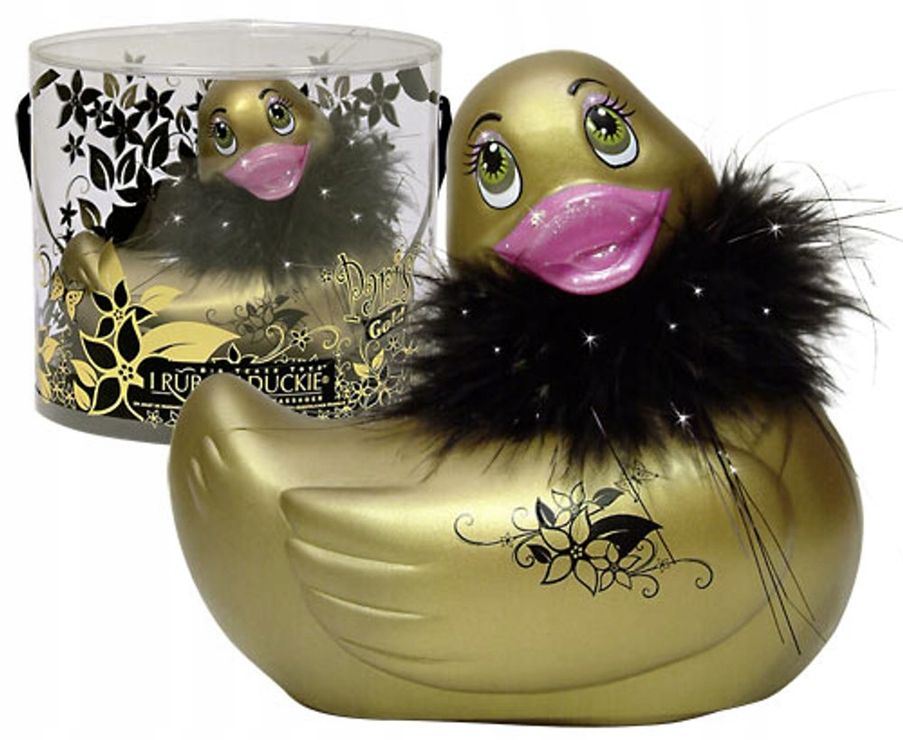 Вибрирующий золотой утенок в ванне служит стимулирующей и массирующей игрушкой. Вибрацию можно запустить простым нажатием кнопки. Клюв украшен серьгой, а сбоку вытатуирован цветок. На шее красивого утенка имеется съемный шарф из перьев.