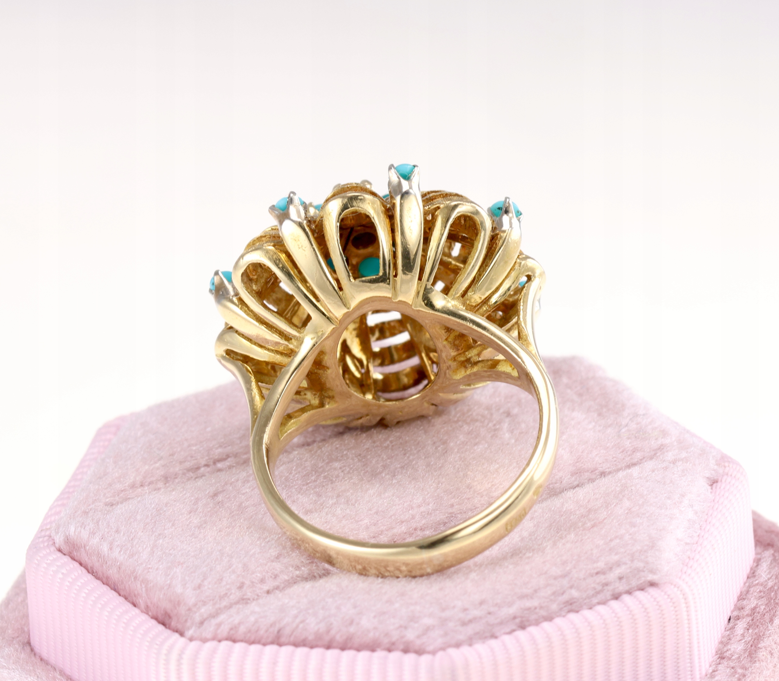 - Размер 12 (внутренний диаметр 16,5 мм) Golden -sample Gold. Захватывающий купол с диаметром 21 мм, он был украшен 15 бирюзовыми. Бирюзовый синий выделяется из теплого оттенка золота, создавая композицию, которая привлекает внешний вид.