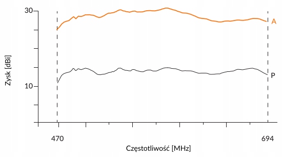 На графике ниже показаны характеристики усиления антенны в зависимости от частоты. Усиление антенны в пассивном режиме отмечено черным цветом (буква П), а характеристики в активном режиме с учетом усиления усилителя отмечены оранжевым цветом (буква «А»). Монтажнику, устанавливающему антенны серии DIPOL SMART, не придется беспокоиться о тестировании разных вариантов антенн путем замены симметрирующего устройства на усилитель или наоборот. На этапе монтажа и измерения сигнала достаточно включить на измерителе напряжение 12 В, чтобы проверить параметры сигнала в обоих режимах работы антенны и выбрать более подходящий. Для непрерывной работы в активном режиме используйте источник питания постоянного тока 12 В, 100 мА.