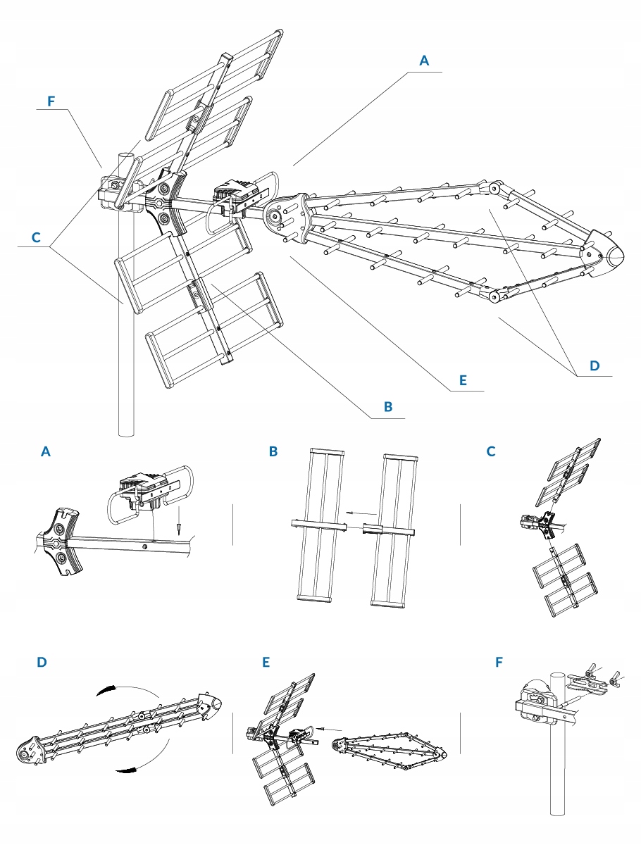 Сборка антенны занимает менее 1,5 минут и не требует каких-либо инструментов. Продуманная конструкция легко собирается. Рефлектор антенны, держатель директора и антенный короб с рамочным диполем крепятся с помощью быстрой, но надежной защелки. Зажим поставляется с 2 барашковыми гайками. Для их затяжки не требуется гаечный ключ.